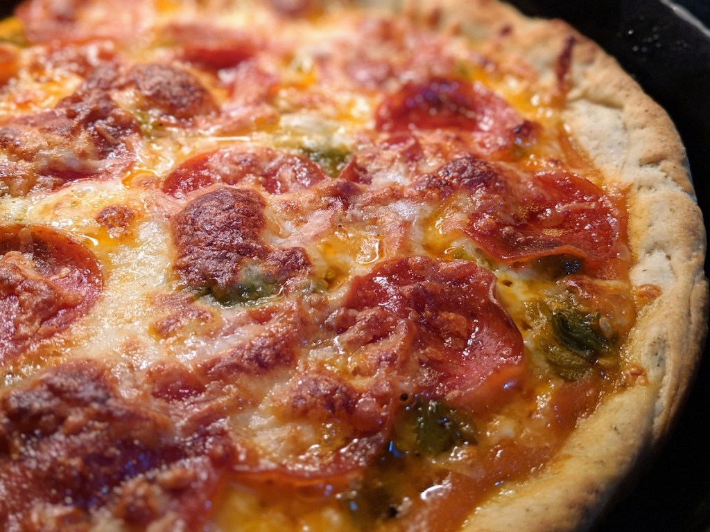 Makes two 10-12″ pizzas. 10″ of rolled dough fit perfectly in an 8″ cast iron skillet.