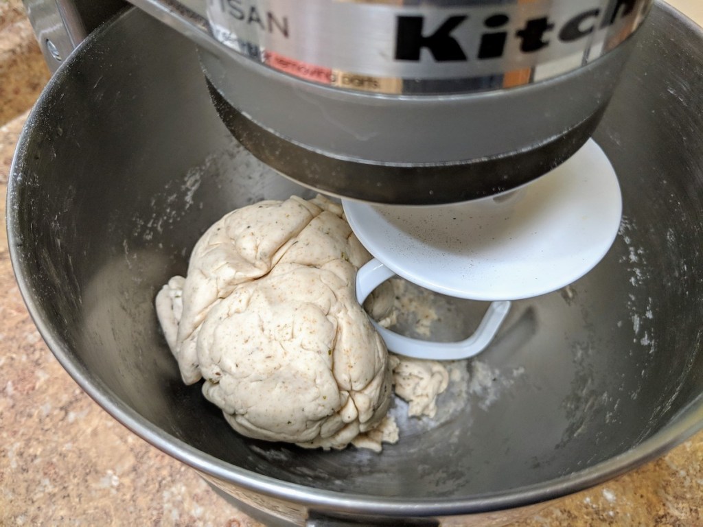I combined all of the above ingredients together in a stand mixer with the dough hook attachment and mixed then kneaded for about 10 minutes. I stopped a few times during the kneading process to form the dough into a ball since it didn’t want to come together too well at the beginning.