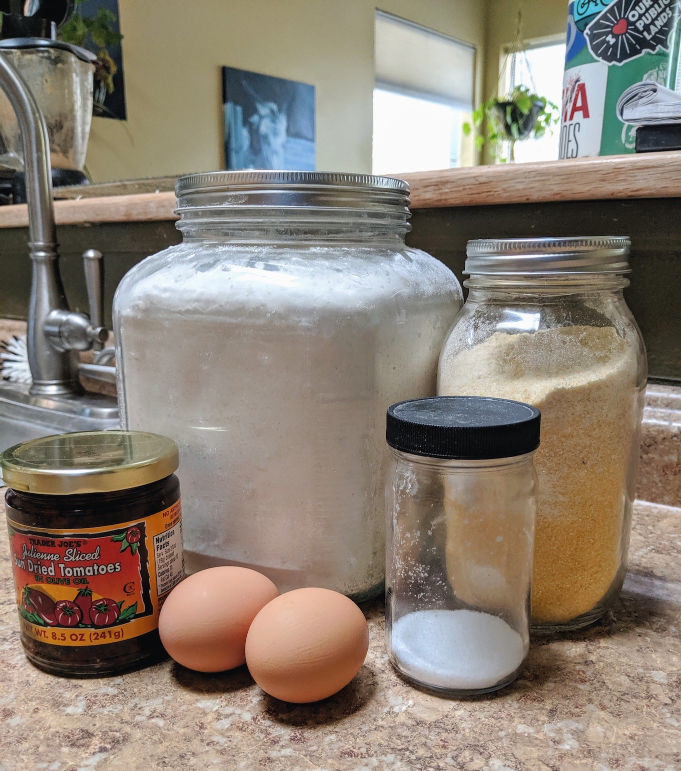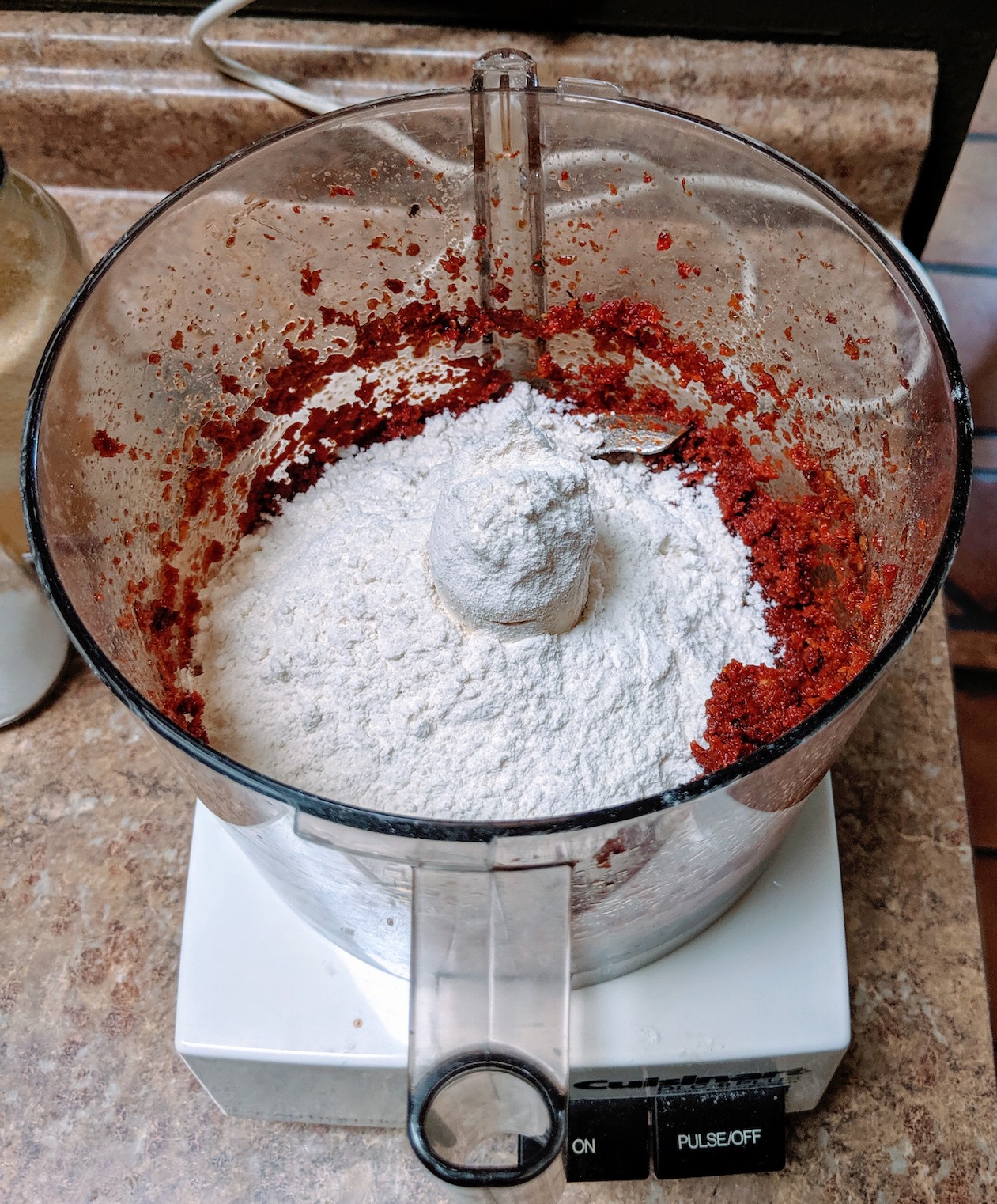 Pour the tomato/flour mixture into the bowl of a stand mixer and then add the rest of the ingredients. With the dough hook or paddle attachment, beat / knead the dough together for 5-7 minutes. If the dough still seems dry, add water 1 Tbsp at a time until it gets smoother.