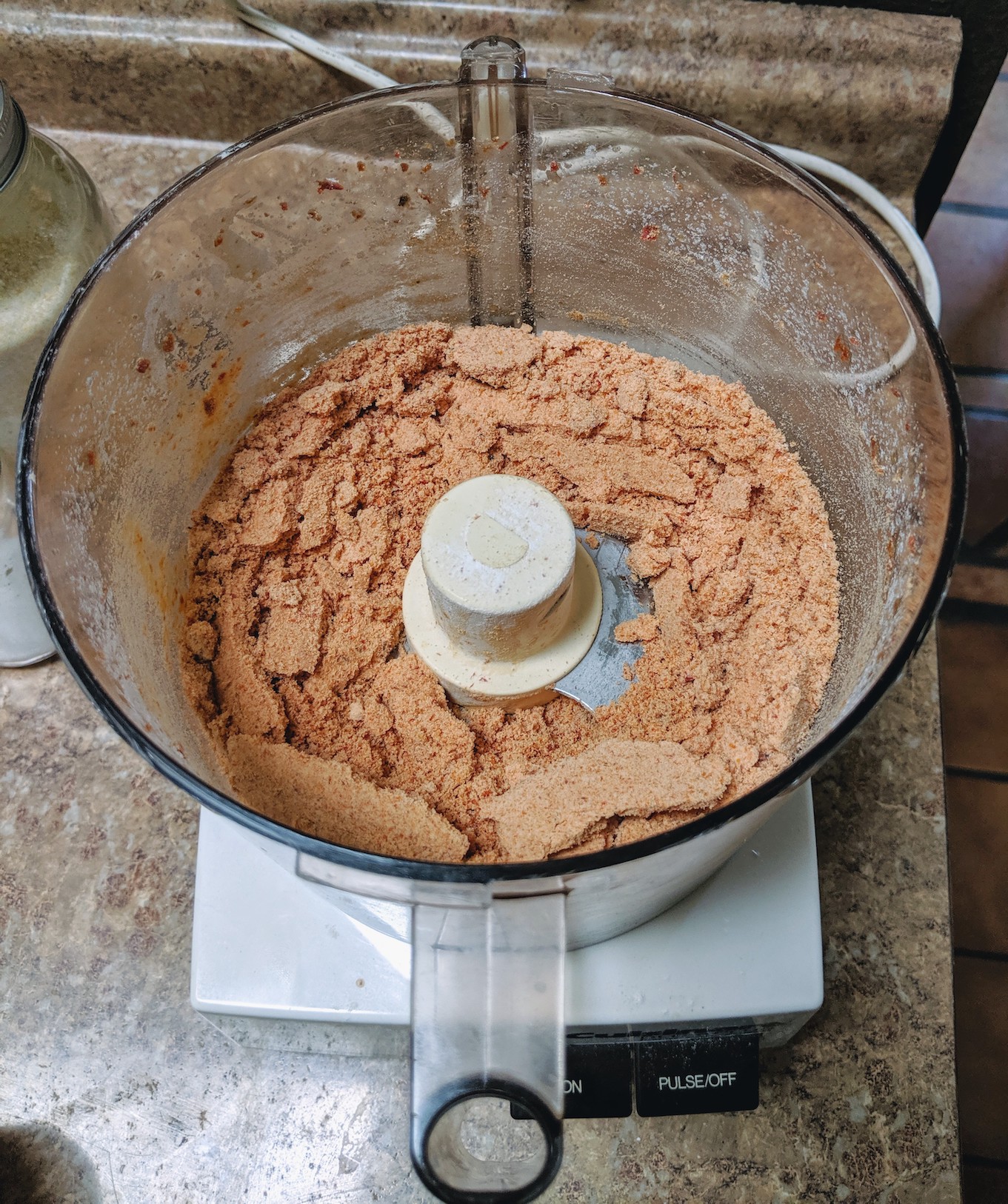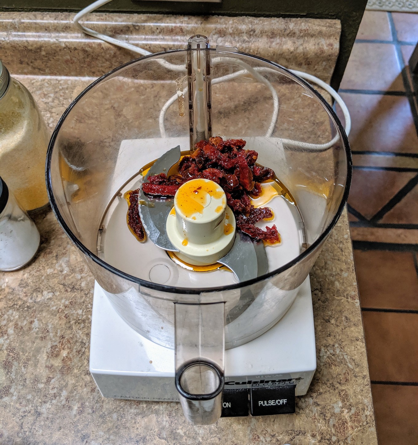 The first thing you’ll want to do is measure out your sun dried tomatoes and add them to a Cuisinart or blender. Blend the tomatoes until they’re very finely chopped. You don’t want any chunks or else it’ll interfere with the pasta rolling and cutting process.