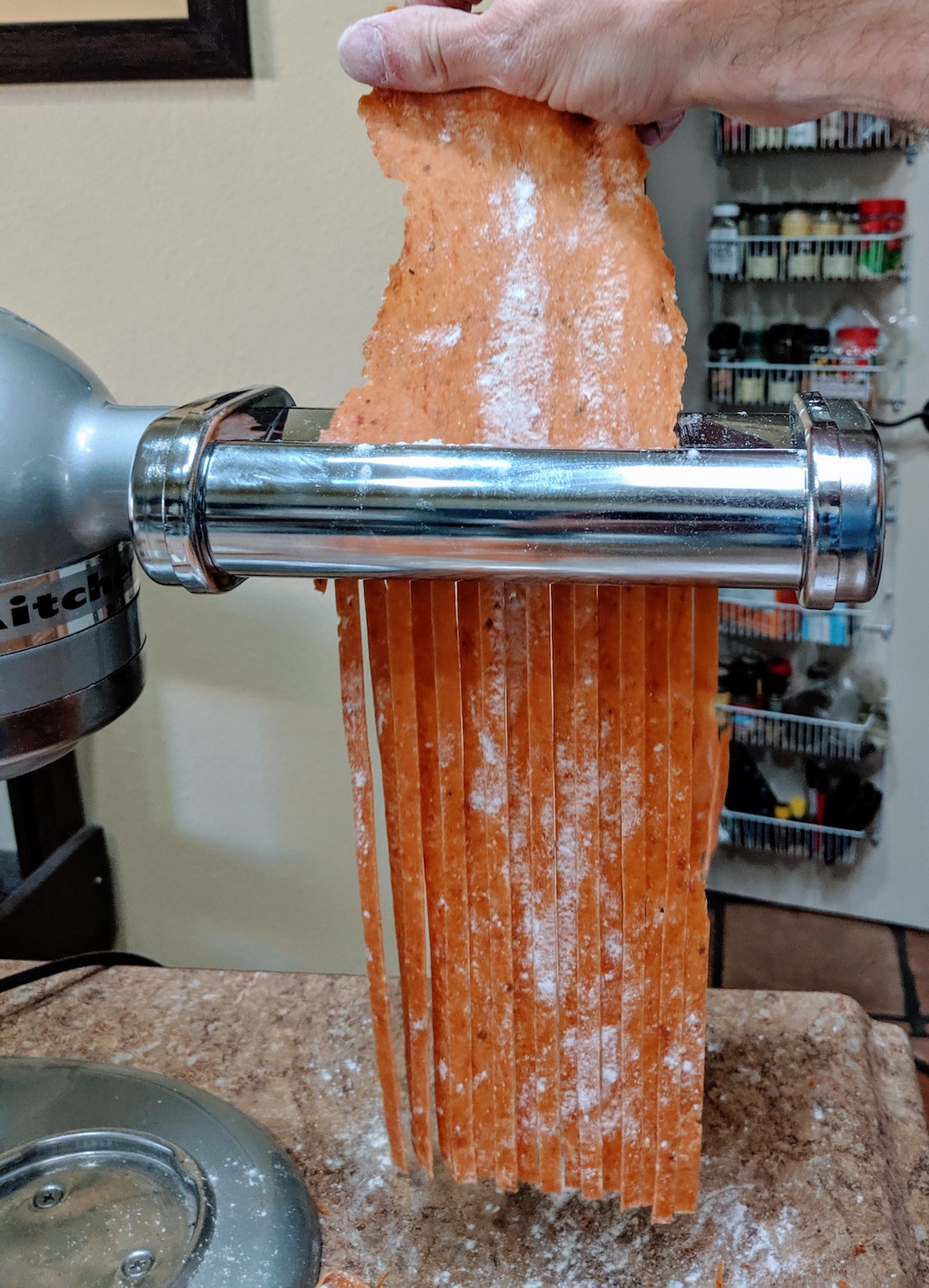 We recently got a pasta roller attachment for our KitchenAid stand mixer so I’ve been playing around with making different pasta. This attempt uses olive oil packed sun dried tomatoes that have been pureed and then combined with the rest of the ingredients. The tomatoes give it a really nice color and flavor.