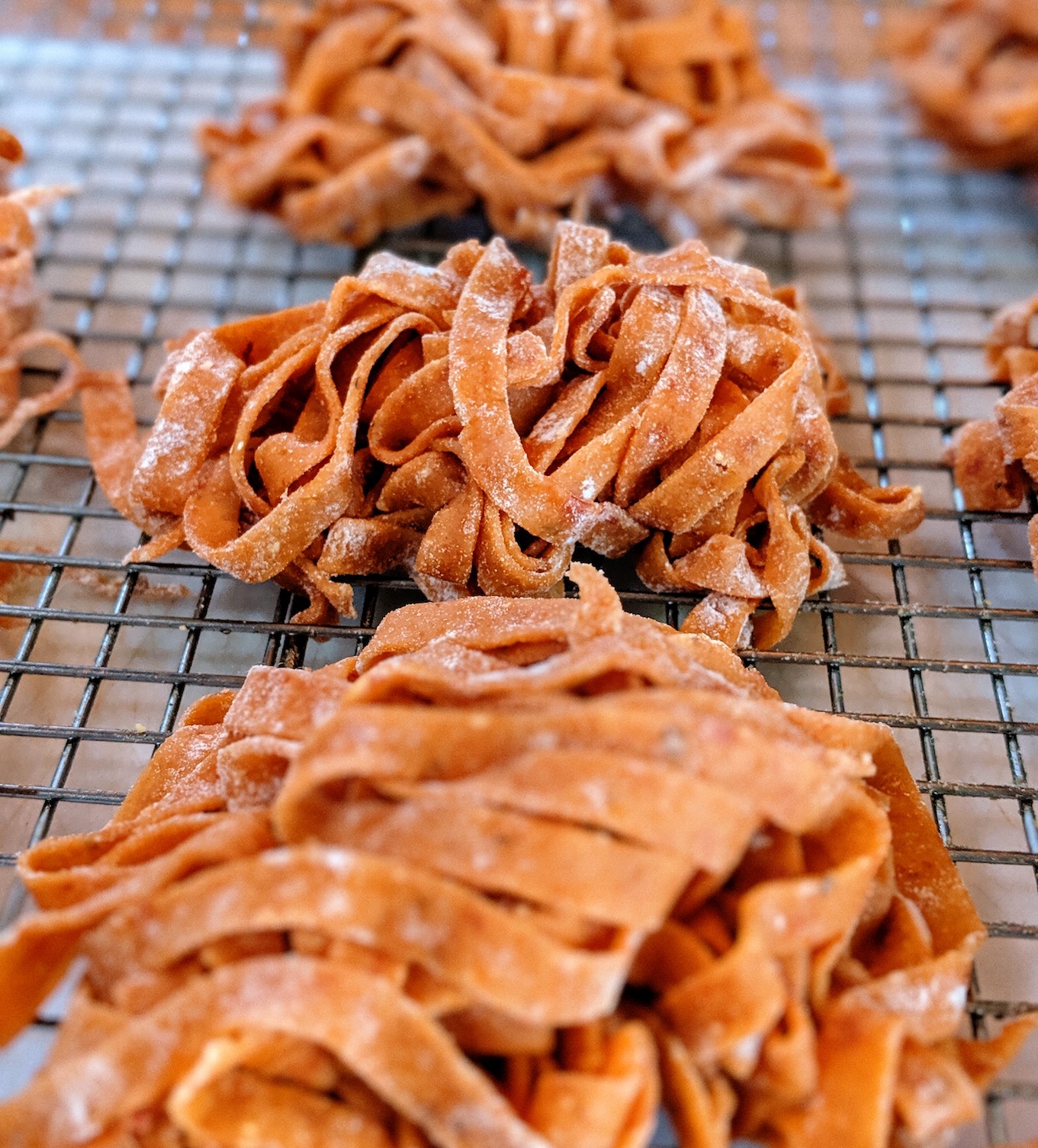 You can let the pasta dry overnight on the wire rack and then freeze it to use it later as well. The recipe above makes enough pasta for about 6 people to enjoy a meal.