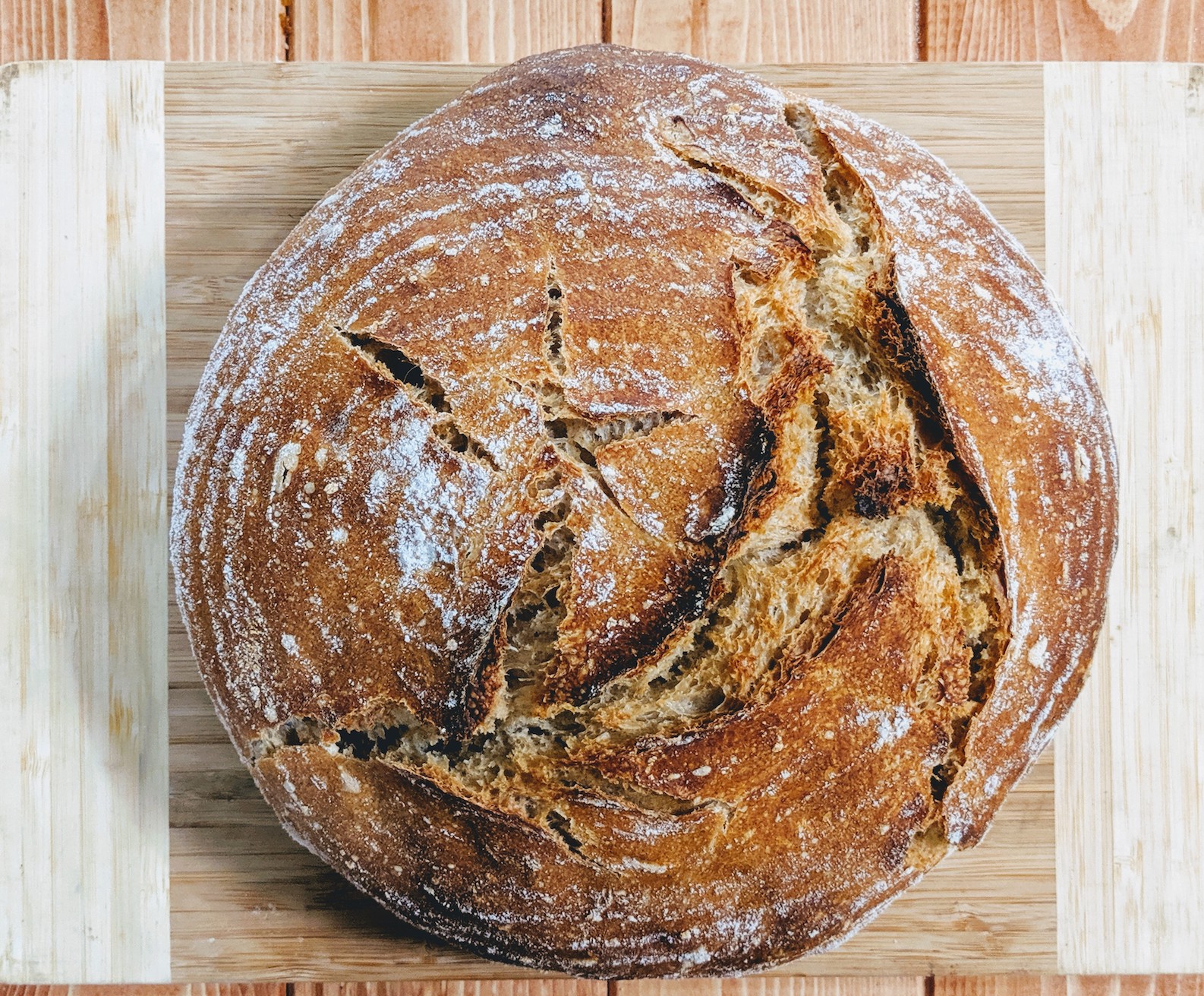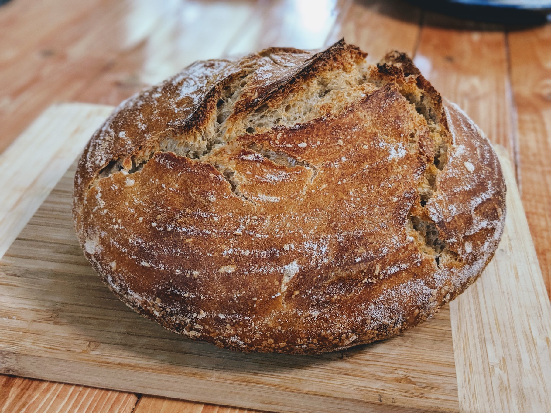 I fermented this bread side-by-side with a loaf from my whole wheat starter and this one definitely was a quicker fermenter and better riser. The crust has some really nice blistering and had some really nice natural scoring that took place in the oven.