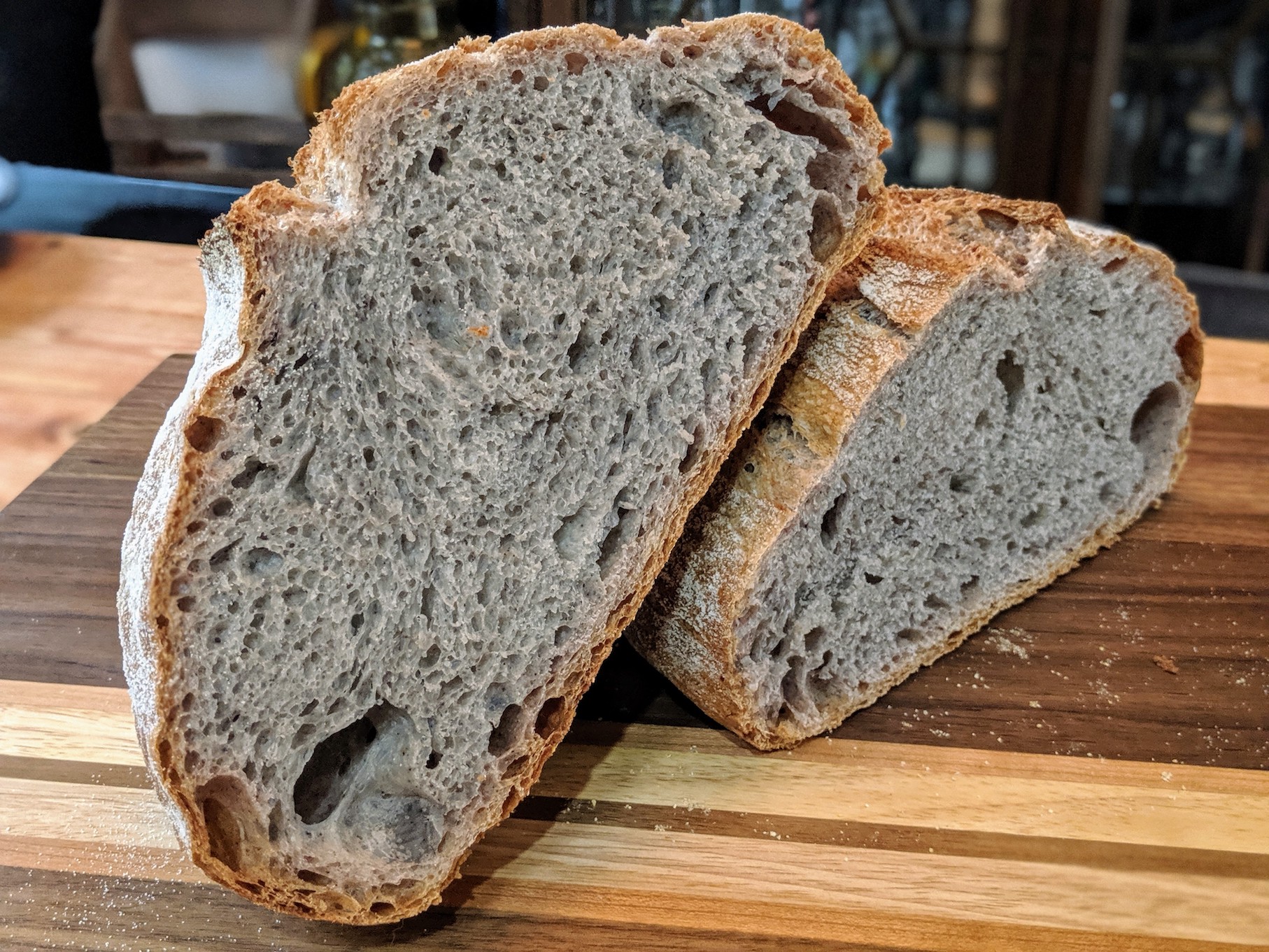 The black rice flour contributed some unexpected flavor as well as some expected color and texture. The flavor of the black rice is a little more earthy with almost some fruitiness that comes through. The crumb is nice and open and the bread vented pretty well in the oven.