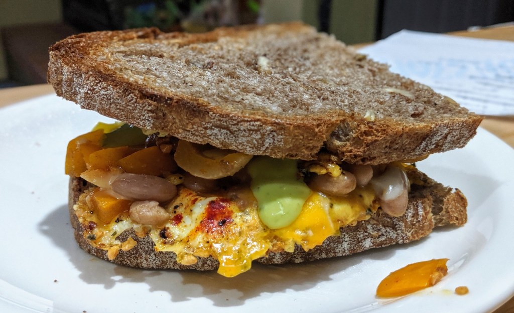 For breakfast this morning I whipped up my usual fried egg with pinto beans, bell peppers, onions, jalapenos and cheese, topped with some guacamole salsa. This bread toasted up nicely and the whole breakfast is extremely satisfying and filling. It keeps me from snacking for a least a couple of hours š
