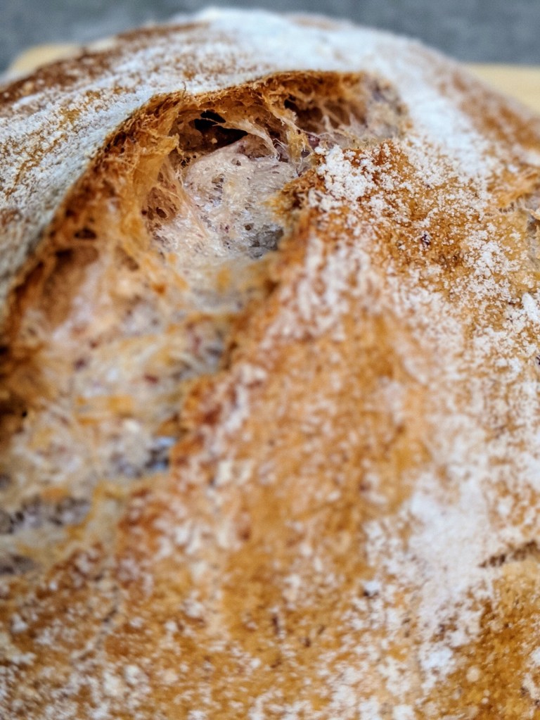 Even though the dough was a mess to fold and proof, it rose better than I expected in the oven. It definitely didn’t have as full of an oven spring as my other loaves usually do, but it didn’t end up like a pancake which was my fear.