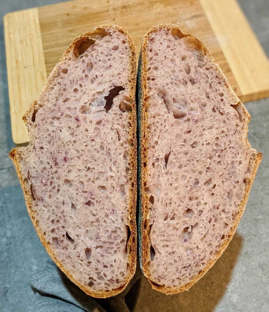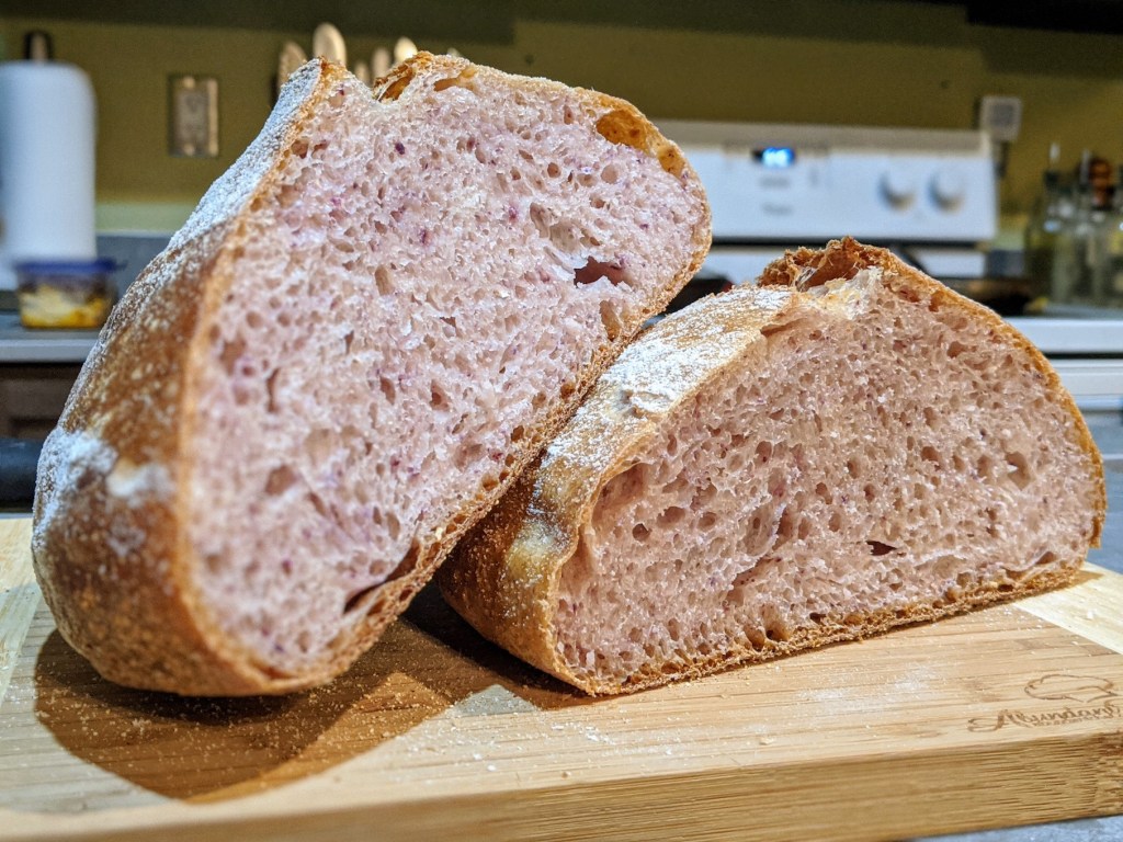 The blue corn gave the bread some really nice pink and purple colors. You get a nice crunch from the blue corn in each bite and the flavor it lends plays well with the sourdough.