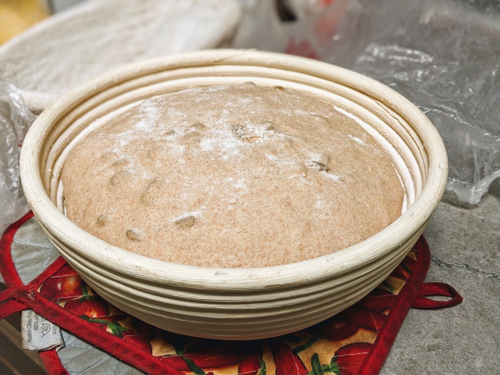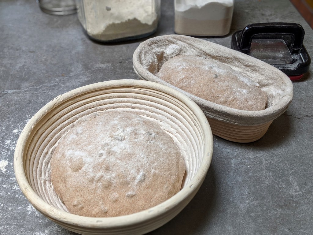 After fermenting I divided the dough and I proofed them for 1 hour in bannetons before placing them in a dutch ovens.