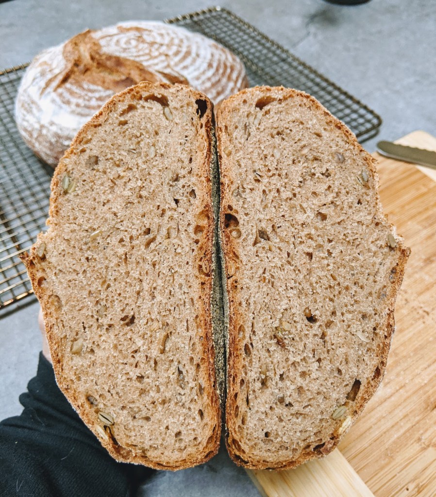 Due to the amount of whole wheat flour in this recipe it ended up being a little on the denser side, but that’s what I was looking for. Given such a high percentage of whole wheat flour, the rise was pretty good.