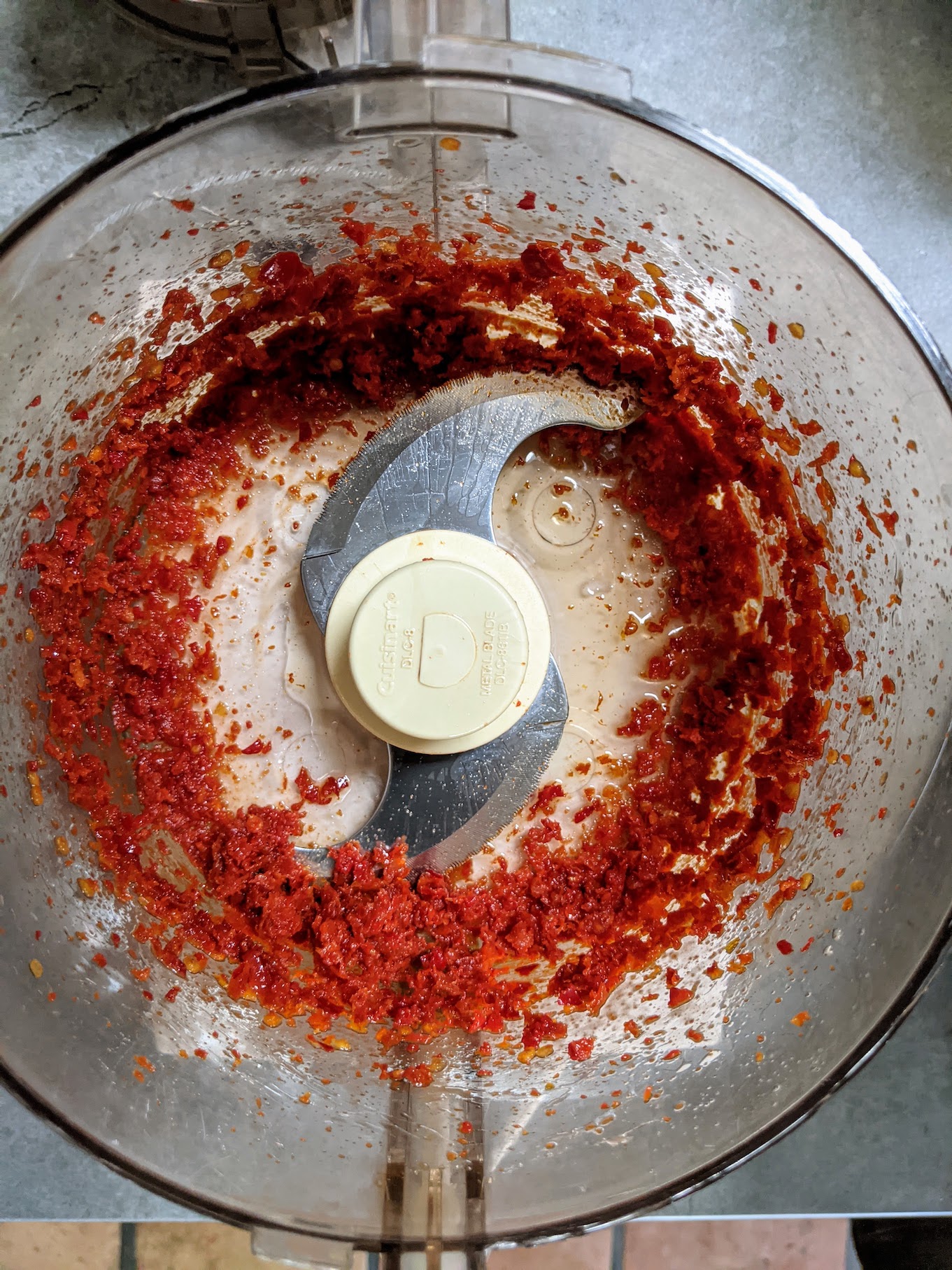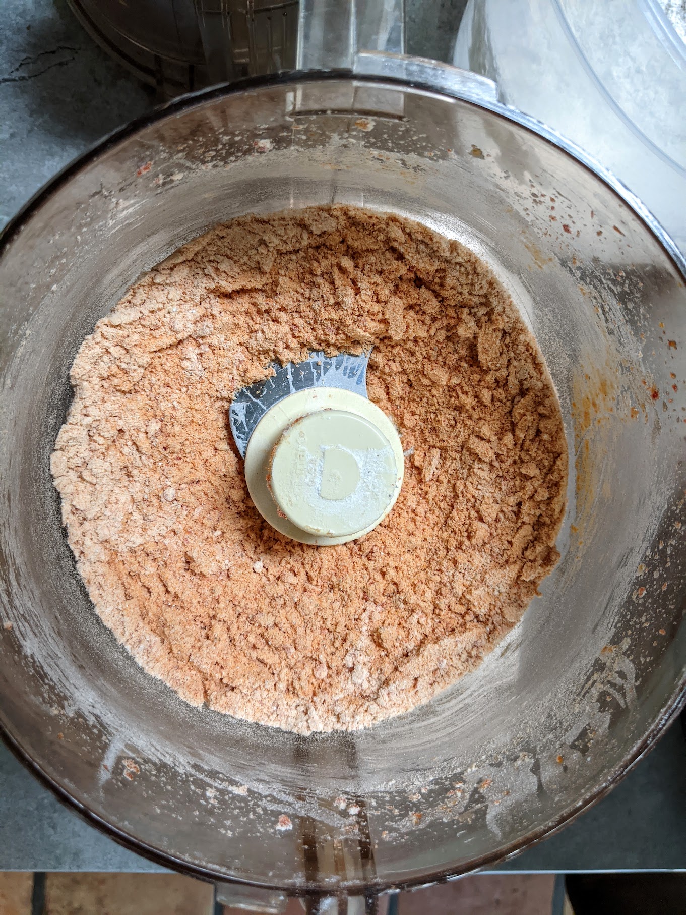 I wanted to try really incorporating the peppers and tomatoes into the dough so I figured the best method would be to blend them and combine them with the flour. To do this, I added the peppers and tomatoes to a cuisinart and pulsed them until they were just shy of a paste. After that I added a half cup of flour (from my pre-weighed portion) and pulsed it a few times. I repeated that two more times until the flour had absorbed all of the pepper and tomato mixture and was a nice red color.