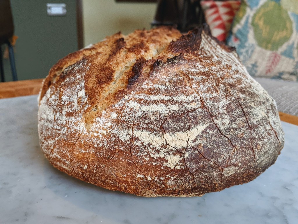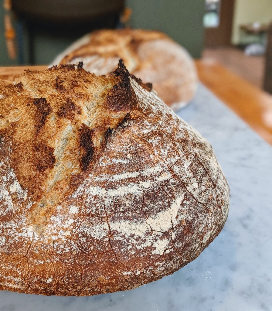 I made a test batch prior to these loaves using 100% Valencia Flour Mill unbleached flour and it was almost like eating a baguette but in boule form. The crust was extremely brittle and the crumb didn’t have very big air pockets. In this trial I wanted to add in some normal bread flour for a little added structure.