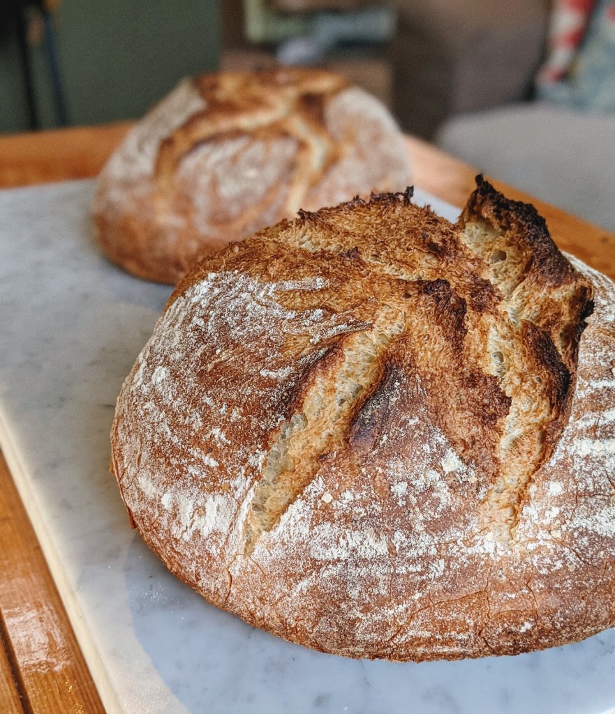 I baked the loaves in preheated dutch ovens at 450’F for 20 minutes covered, then removed the lid of each dutch oven and baked for an additional 32 minutes.