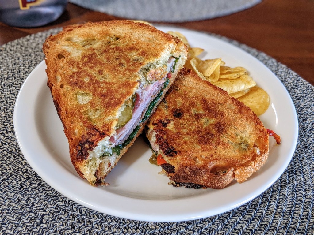I also ended up using this bread today for a pressed sandwich. I had swiss cheese, pesto (red and green), spinach, ham, roast beef, giardinera, pickles and caramelized onions on it. Talk about a flavor packed sandwich!