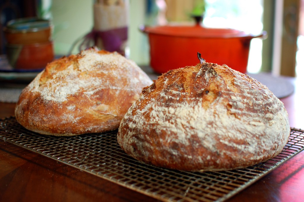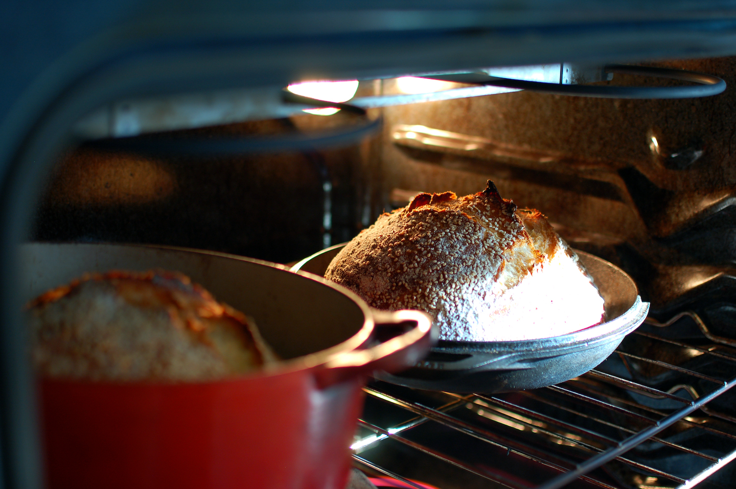 I started preheating the oven right after I started proofing the loaves. After roughly an hour proof I baked the loaves in preheated dutch ovens at 450’F for 20 minutes covered, then removed the lid of the dutch oven and baked for an additional 31 minutes.