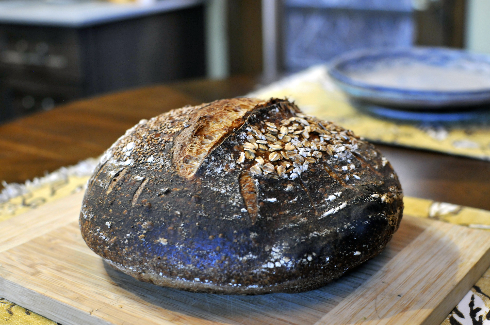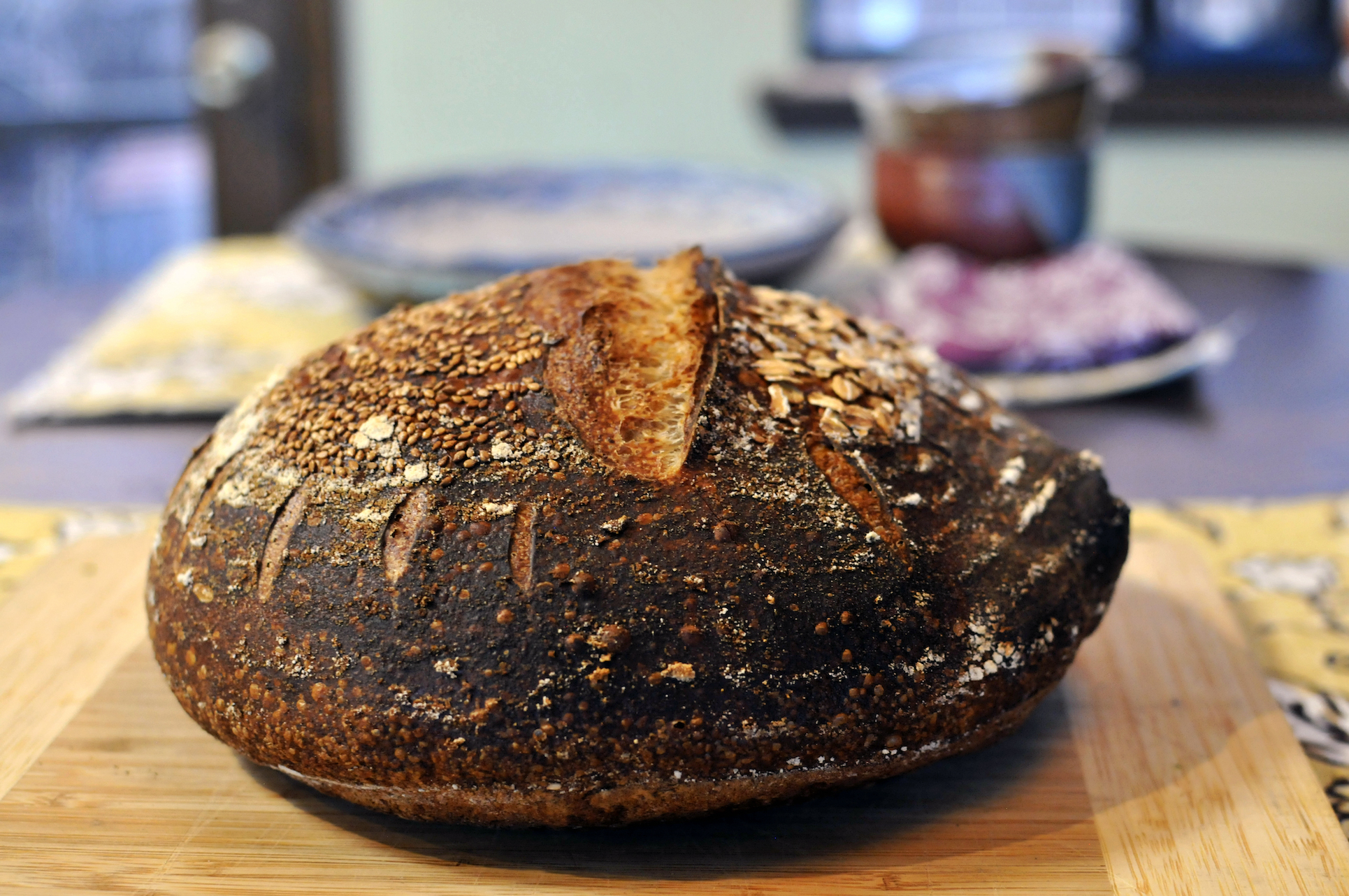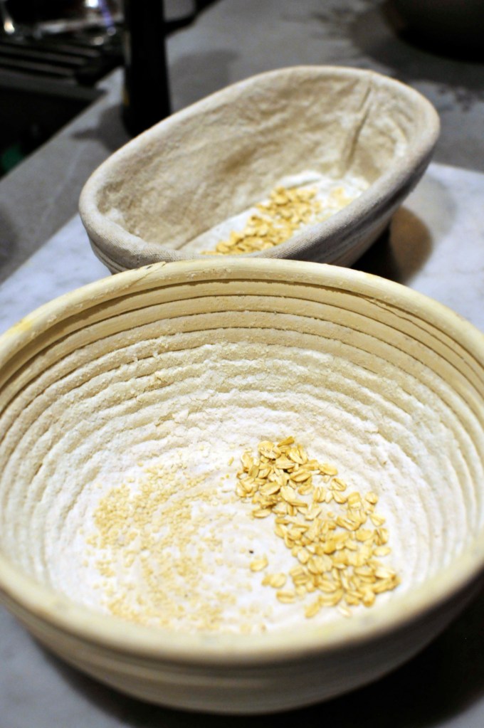 Once the dough had doubled, I shaped it into loaves and put them in bannetons that I liberally dusted with rice flour, oats and sesame seeds. I put the bannetons in vegetable bags and then placed them in the fridge for a 17 hour cold proof.