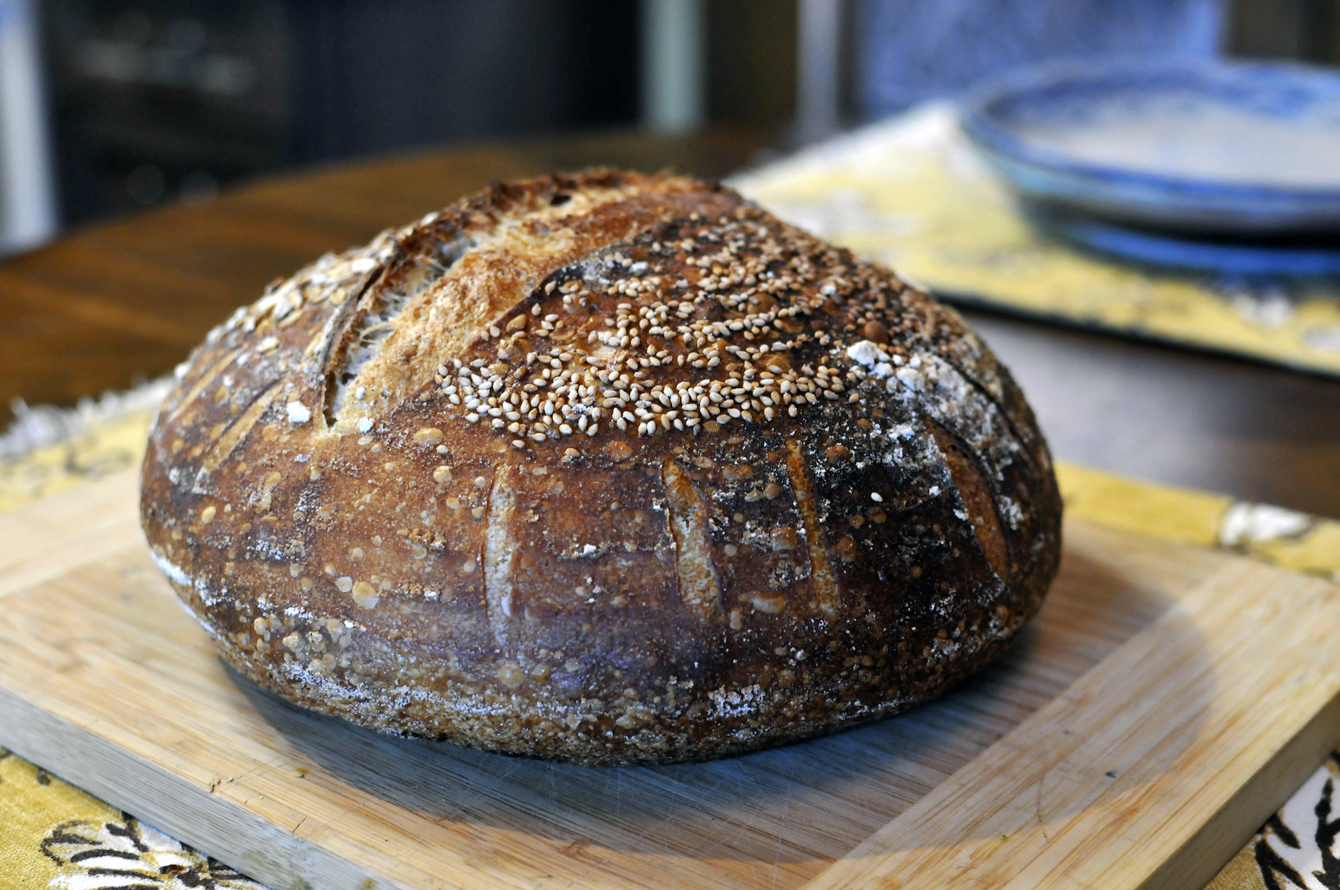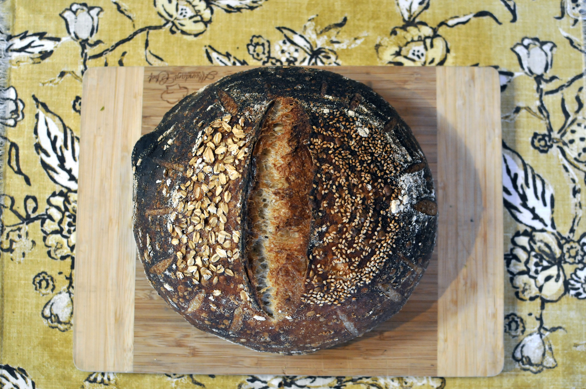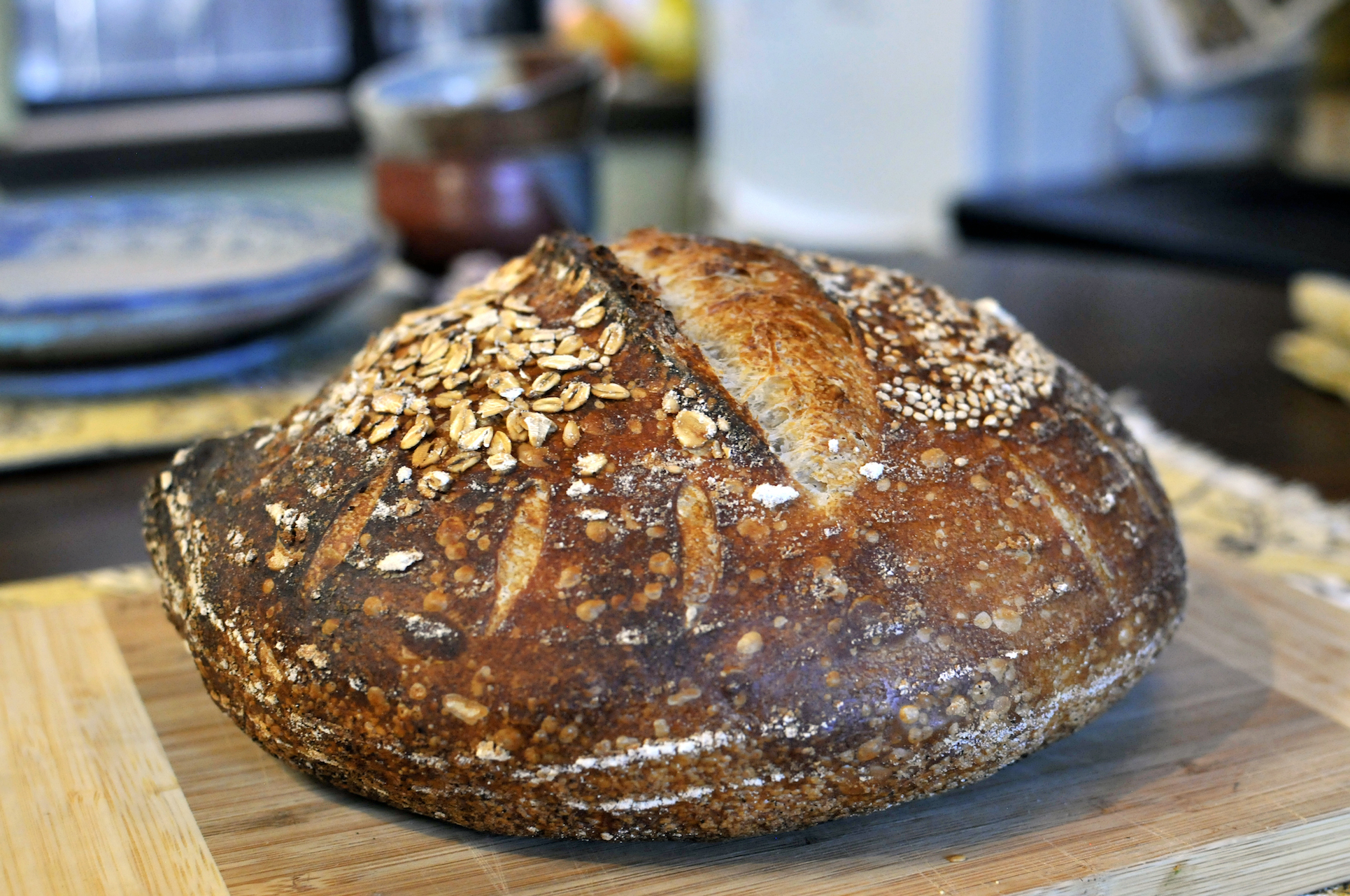 Once the dough had doubled, I shaped it into loaves and put them in bannetons that I liberally dusted with rice flour, oats and sesame seeds. I put the bannetons in vegetable bags and then placed them in the fridge for a 17 hour cold proof.