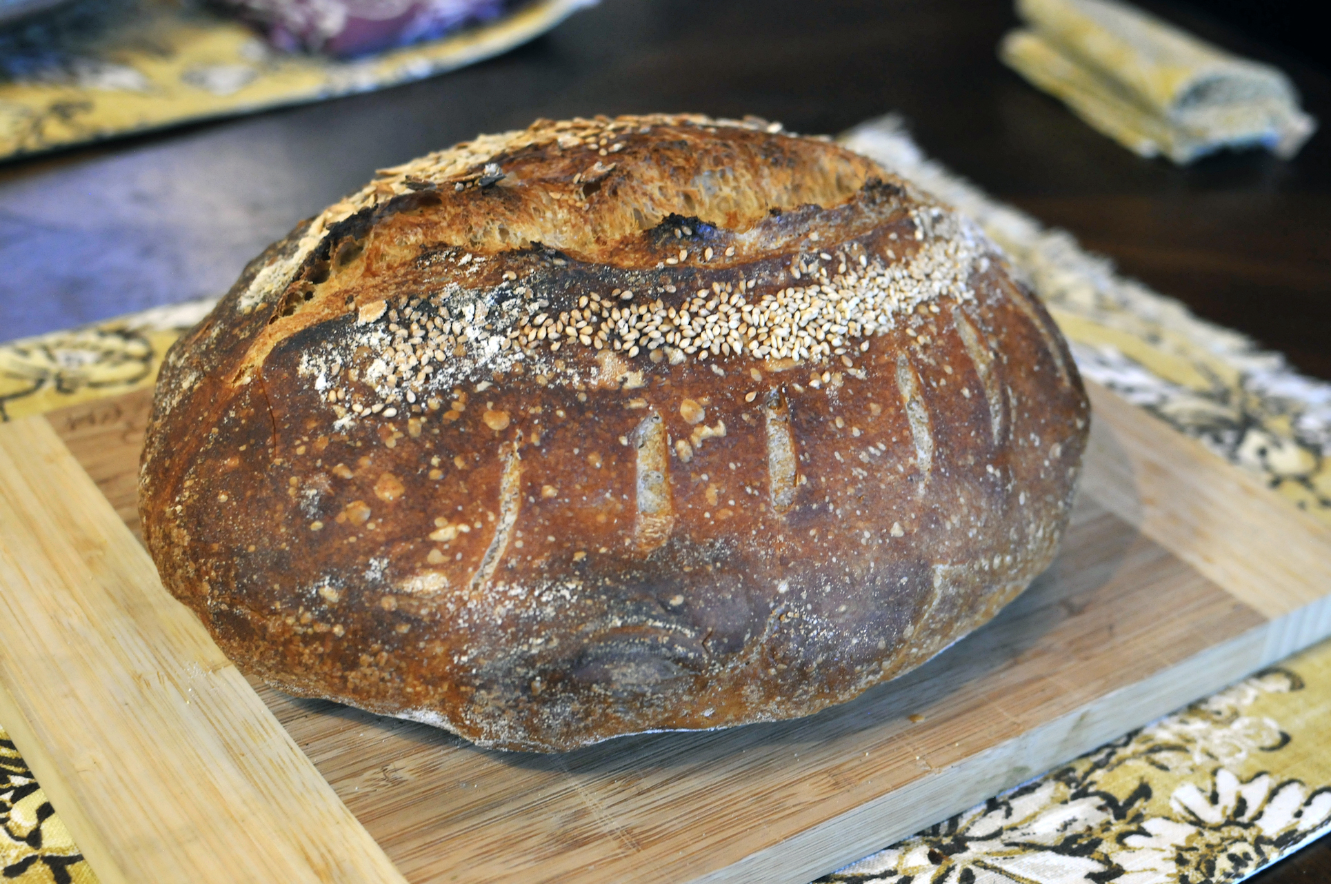 One hour before baking I started preheating the oven, with dutch ovens inside, to 450’F. When it was time to bake, I took the loaves straight from the fridge and placed them in the preheated dutch ovens, gave them a quick score and then put them in the oven.