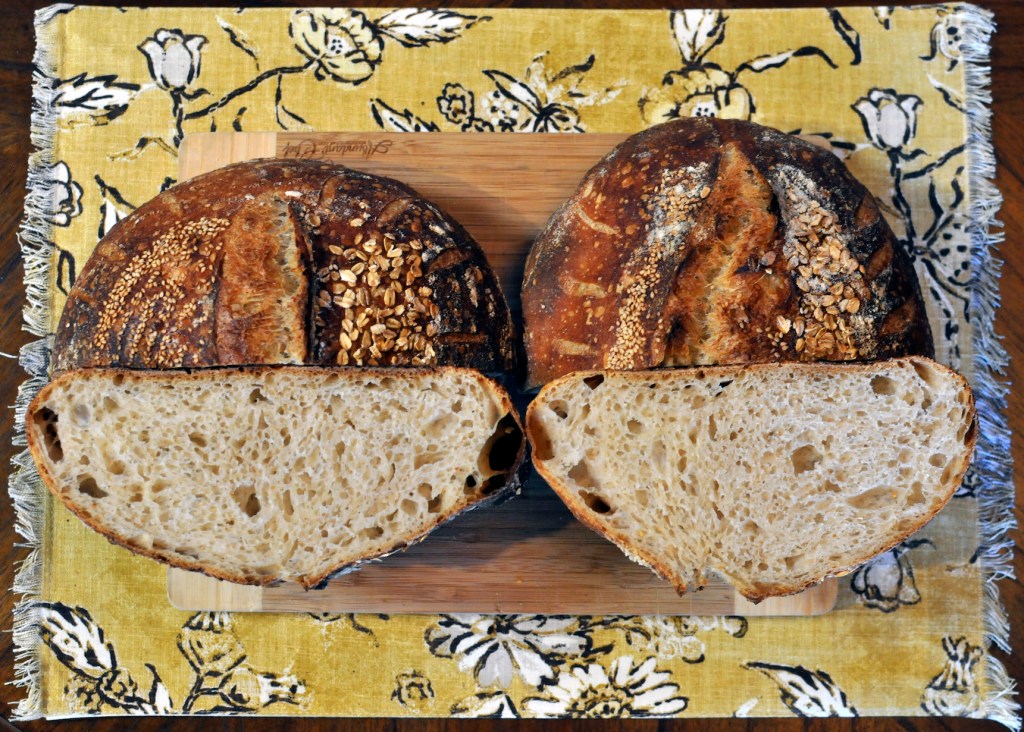 I baked the loaves at 450’F for 20 minutes covered, then removed the lid of the dutch ovens and baked for an additional 30 minutes.