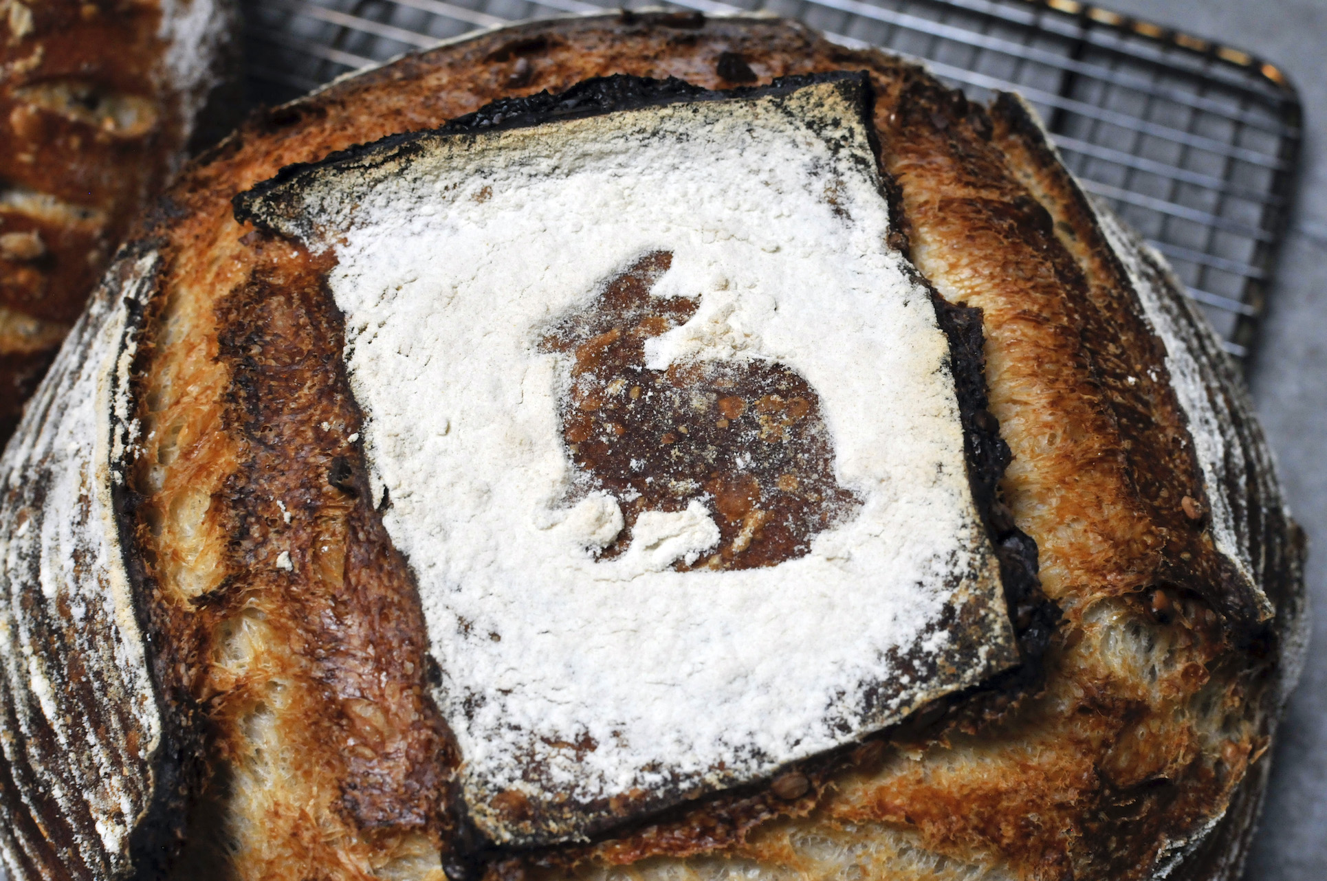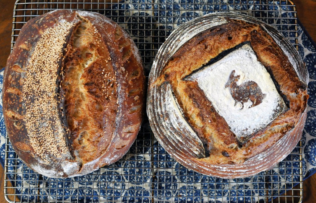 One hour before baking I started preheating the oven, with dutch ovens inside, to 450’F. When it was time to bake, I took the loaves straight from the fridge and placed them in the preheated dutch ovens, gave them a quick score and then put them in the oven. For the loaf that was getting the rabbit stencil, I added it to the top of the loaf and then used a fine mesh sifter to dust some flour over it. I removed the stencil and put the loaf in the oven.