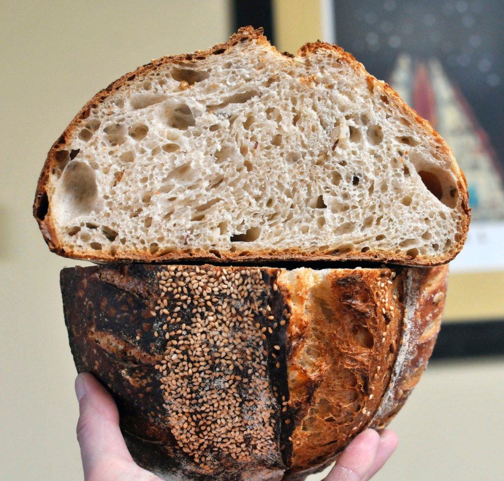 I’m really happy with how these loaves turned out. The honey is subtle but was apparent when the loaves first came out of the oven. The shaved almonds and sunflower seeds are distributed very well throughout the crumb. Next time I might try adding more of each, or using solely shaved almonds.
