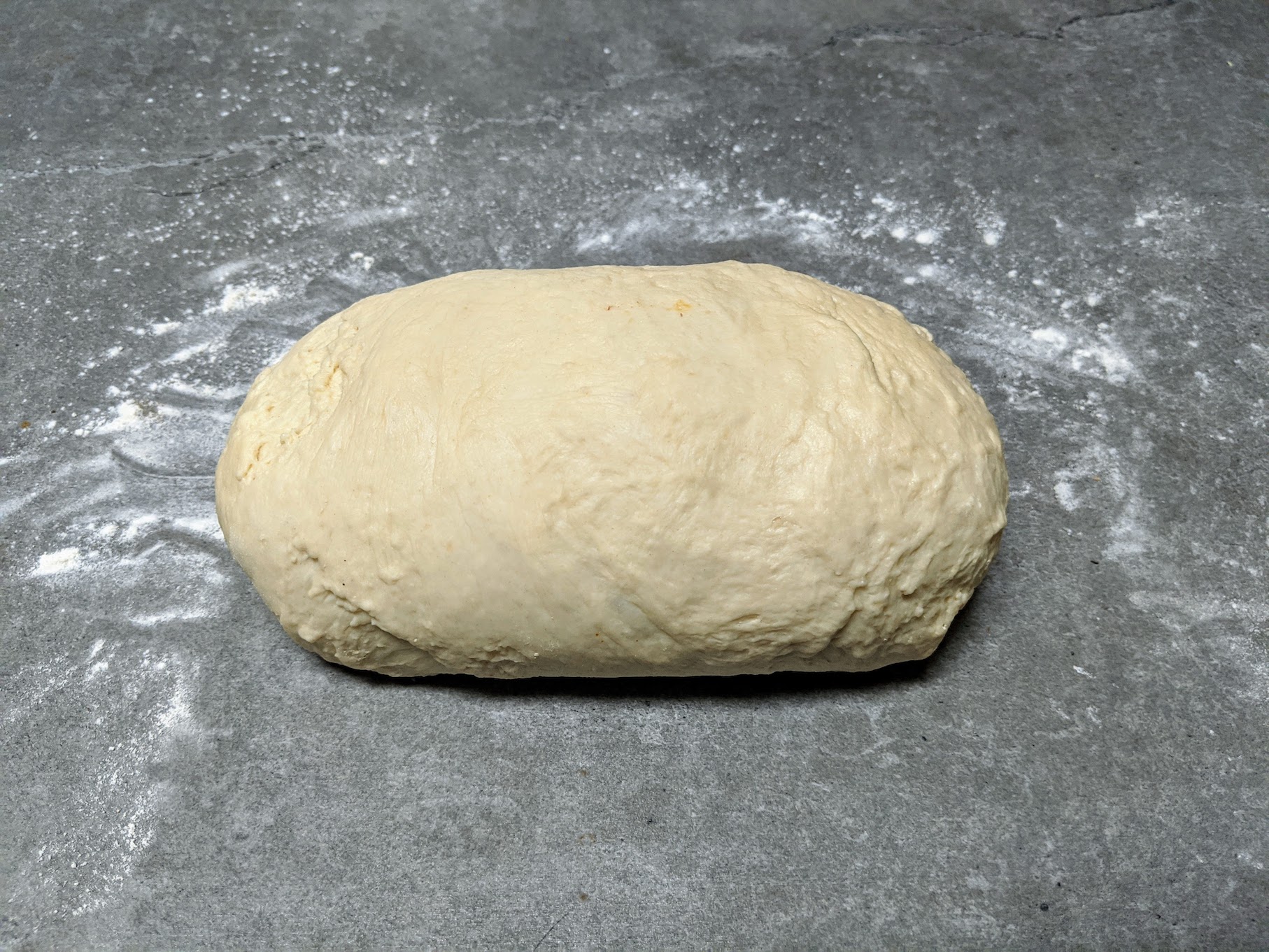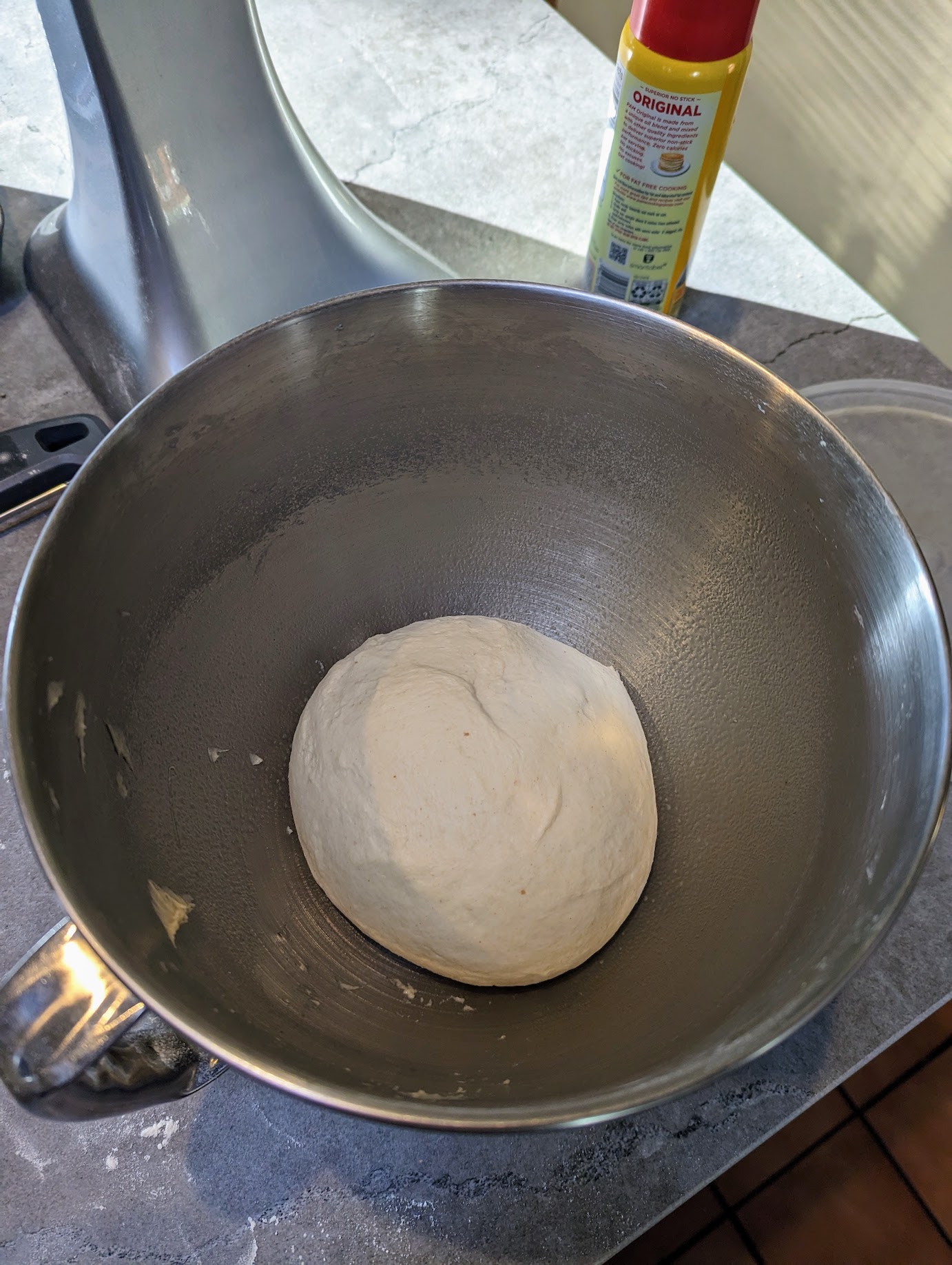 Flour a work surface and knead the dough by hand for 1-2 minutes. Form it into a ball and place it back in the mixing bowl (after spraying with a little cooking oil). Cover the bowl and allow to rise in a warm location for 3-3.5 hours, or until roughly doubled in size.