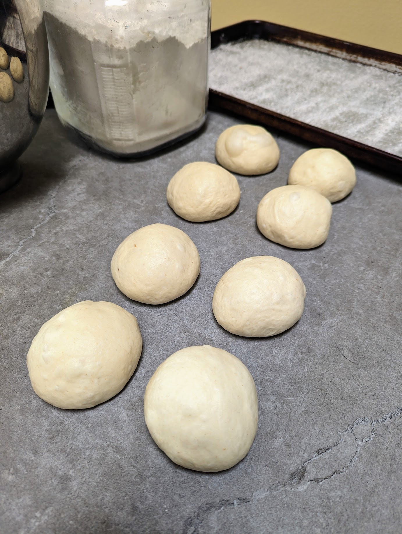 After the dough has doubled in size, transfer it to a floured work surface and then shape it into a rectangle. Divide the dough into 8 equal pieces (each piece should be 115-120 grams). Roll each of those dough pieces into a ball and let them rest on the counter for about 5-10 minutes (this lets the dough relax and helps the creases on the bottom of the ball meld together.