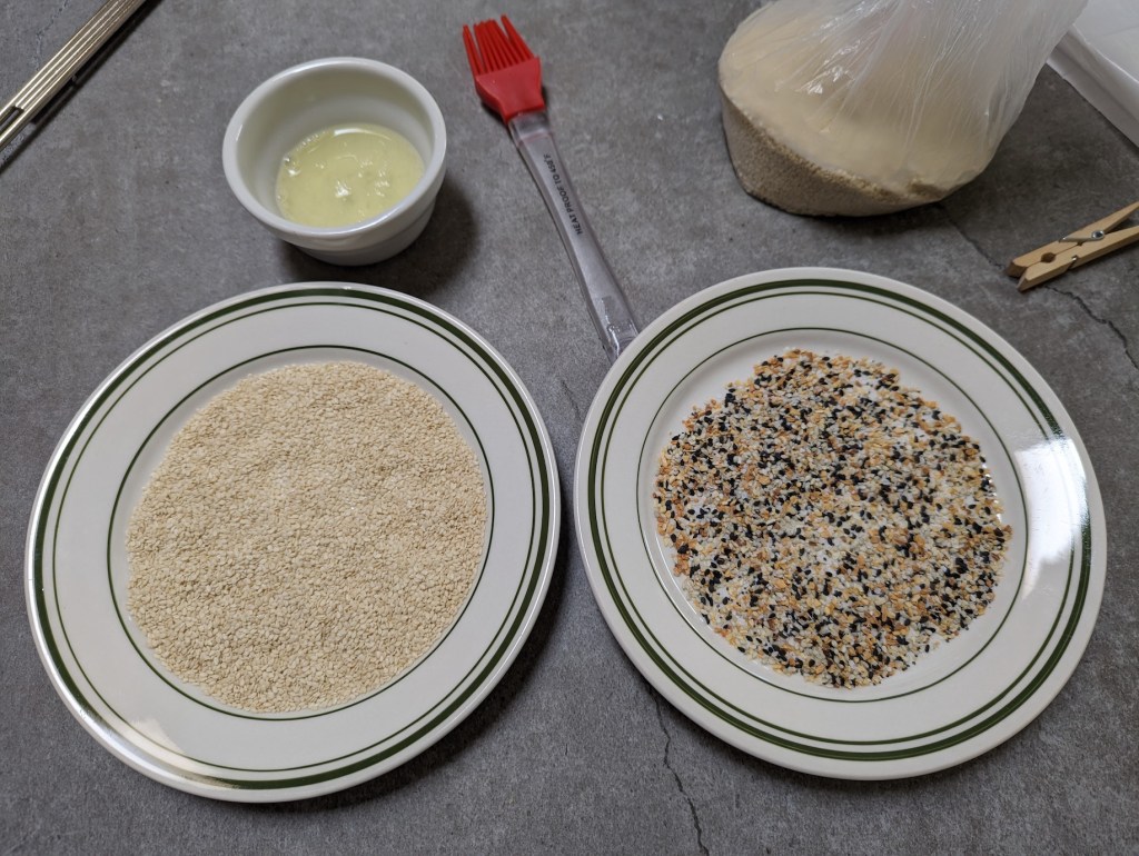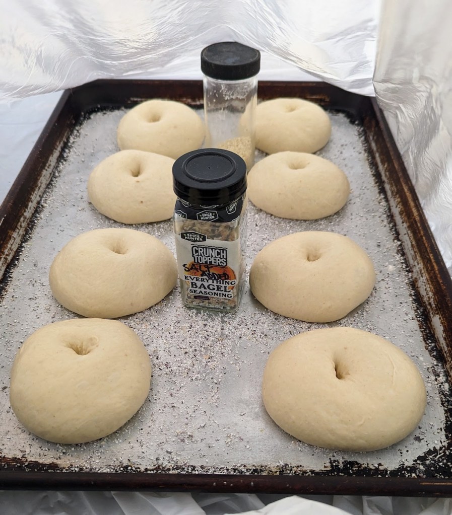 Let the bagels proof for 3-3.5 hours. While the bagels are proofing, get your egg wash and toppings ready (if you’re using them).