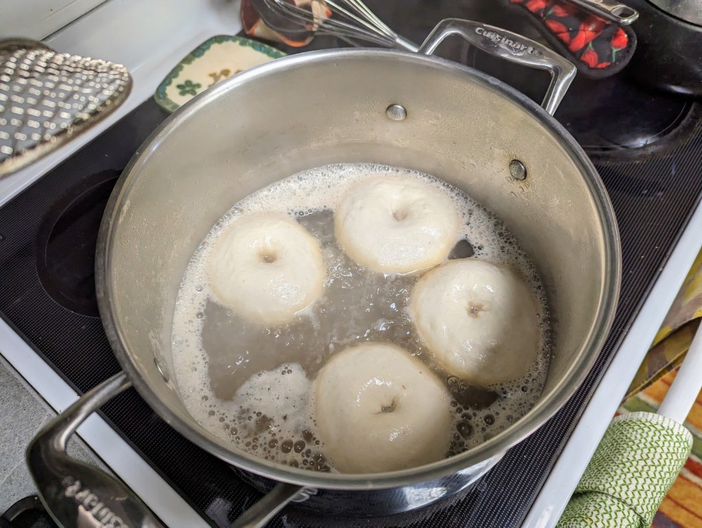 About 30 minutes before your bagels are finished proofing, preheat your oven to 435’F and get your water bath ready.