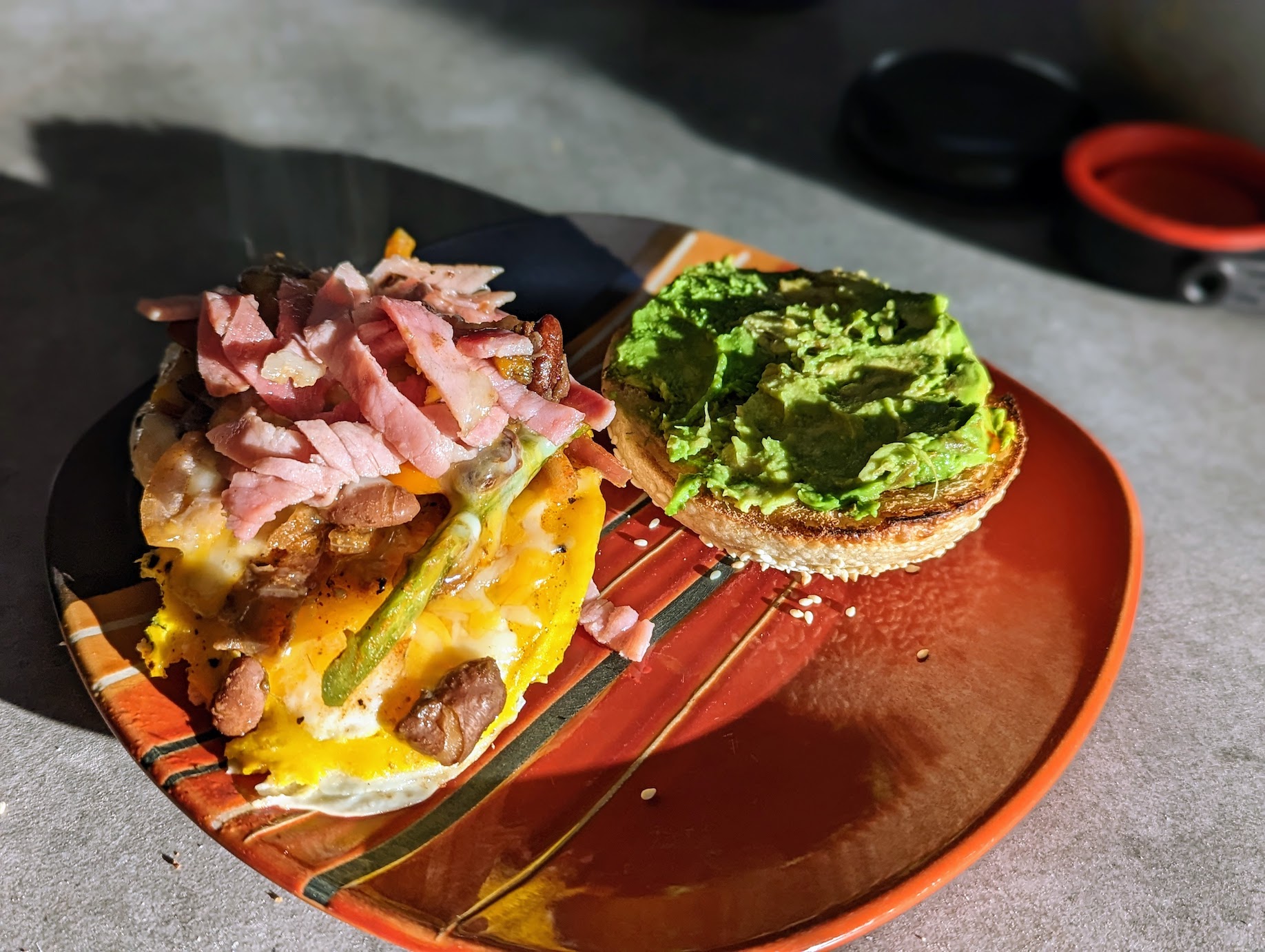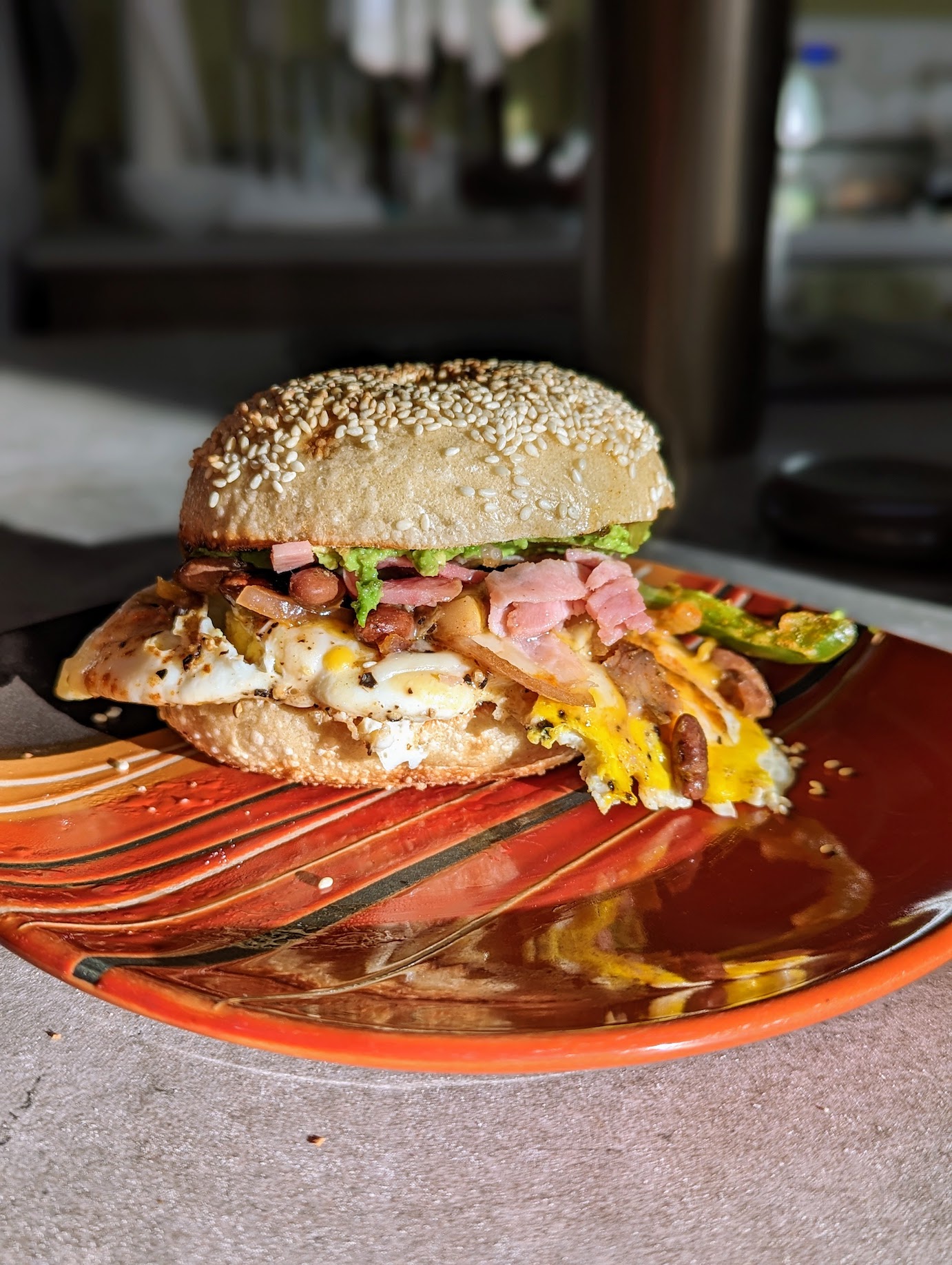 This test batch didn’t get a big hole in the middle, which is fine for making breakfast sandwiches. I toasted my bagel and loaded it up with avocado, Peruvian pepper jam, egg, jalapenos, bell peppers, onion, pinto beans, ham and cheese.