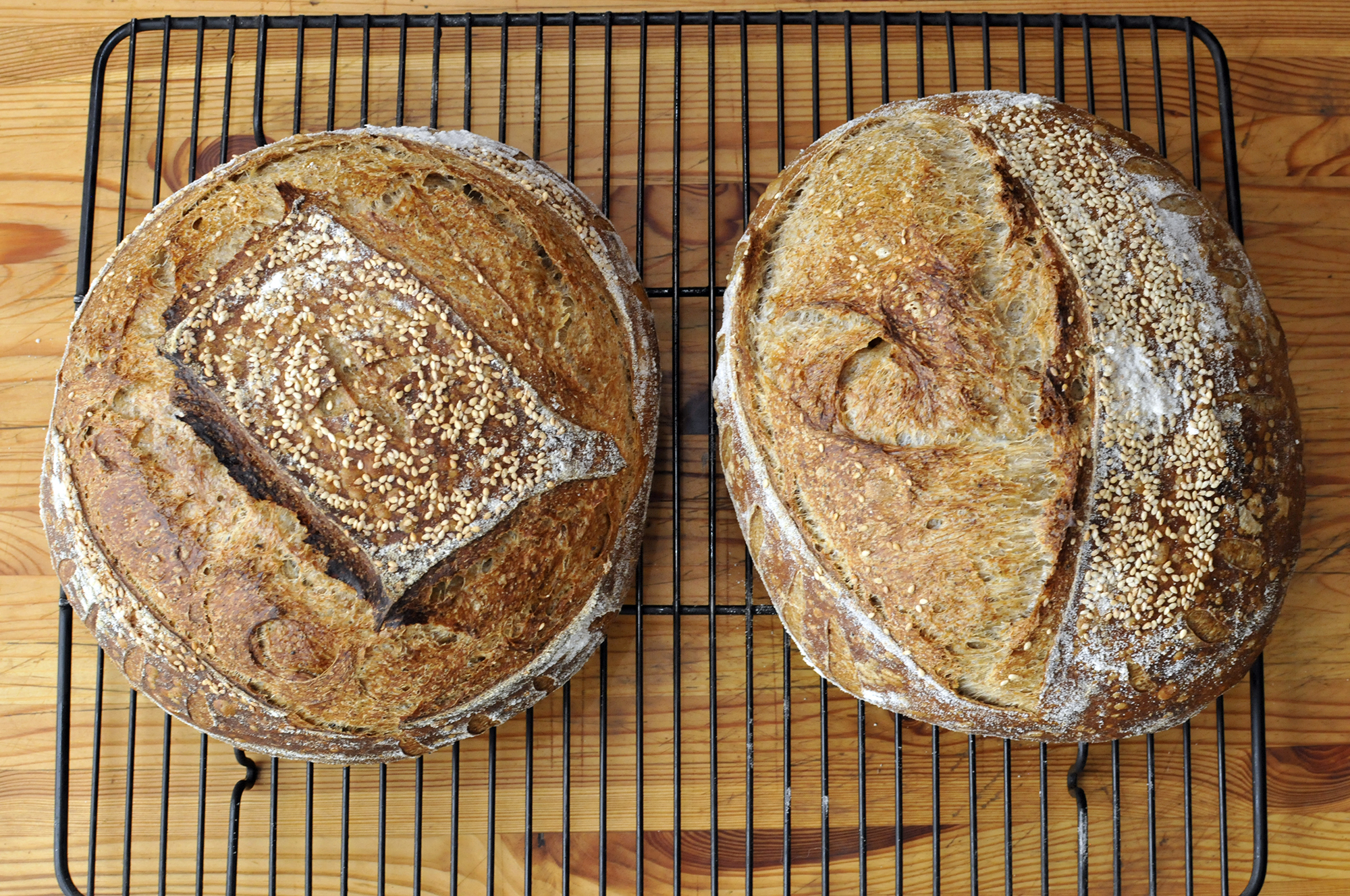 Once the dough had doubled, I shaped the loaves and put them in bannetons that I liberally dusted with rice flour and threw some sesame seeds into. I put the bannetons in vegetable bags and then placed them in the fridge for a 16 hour cold proof.