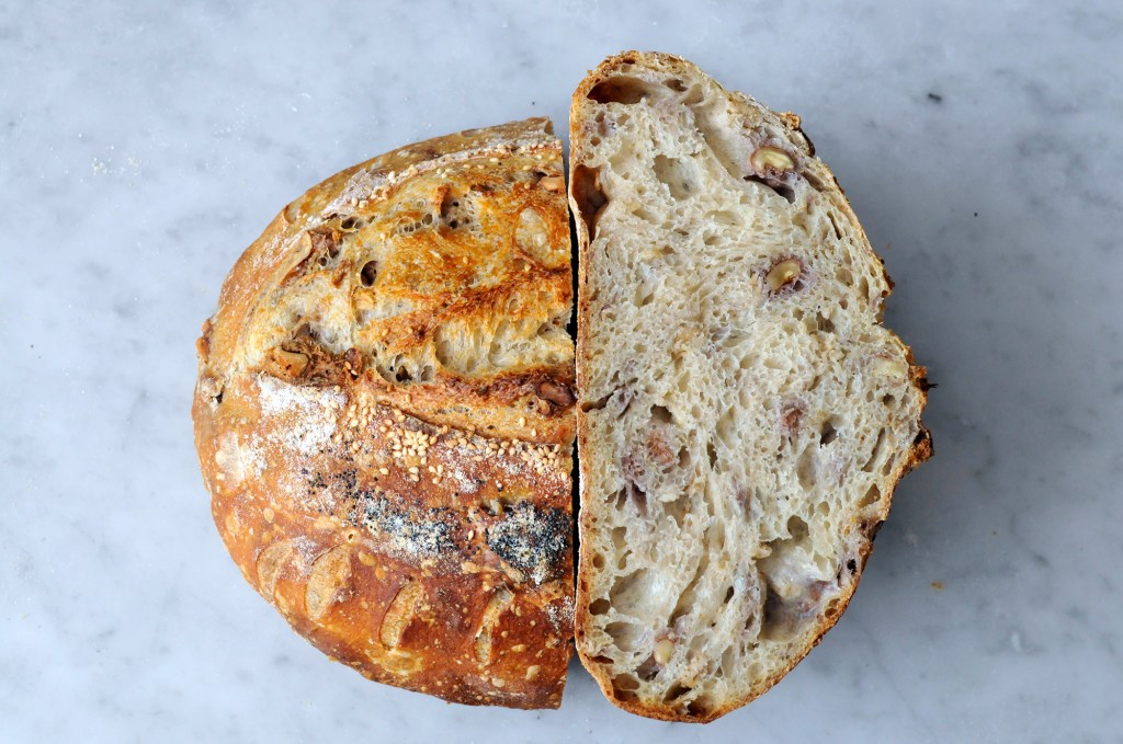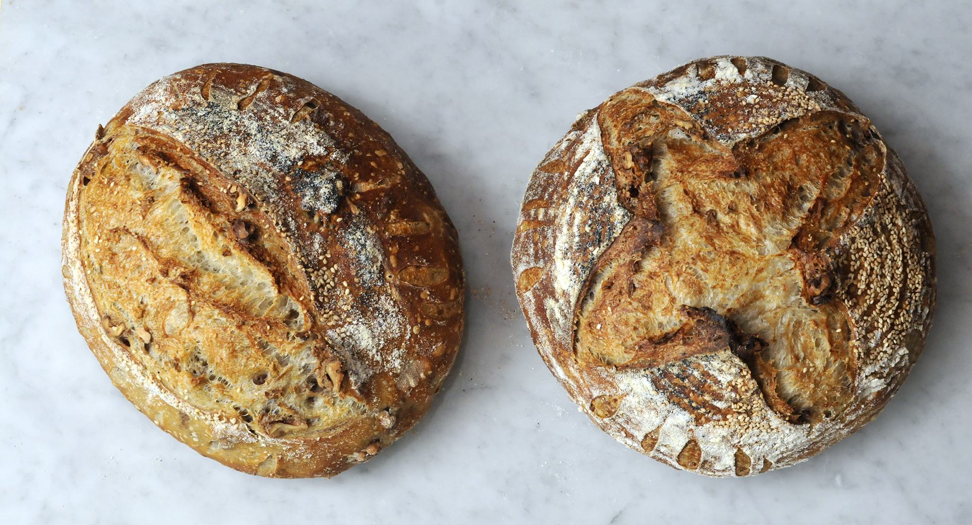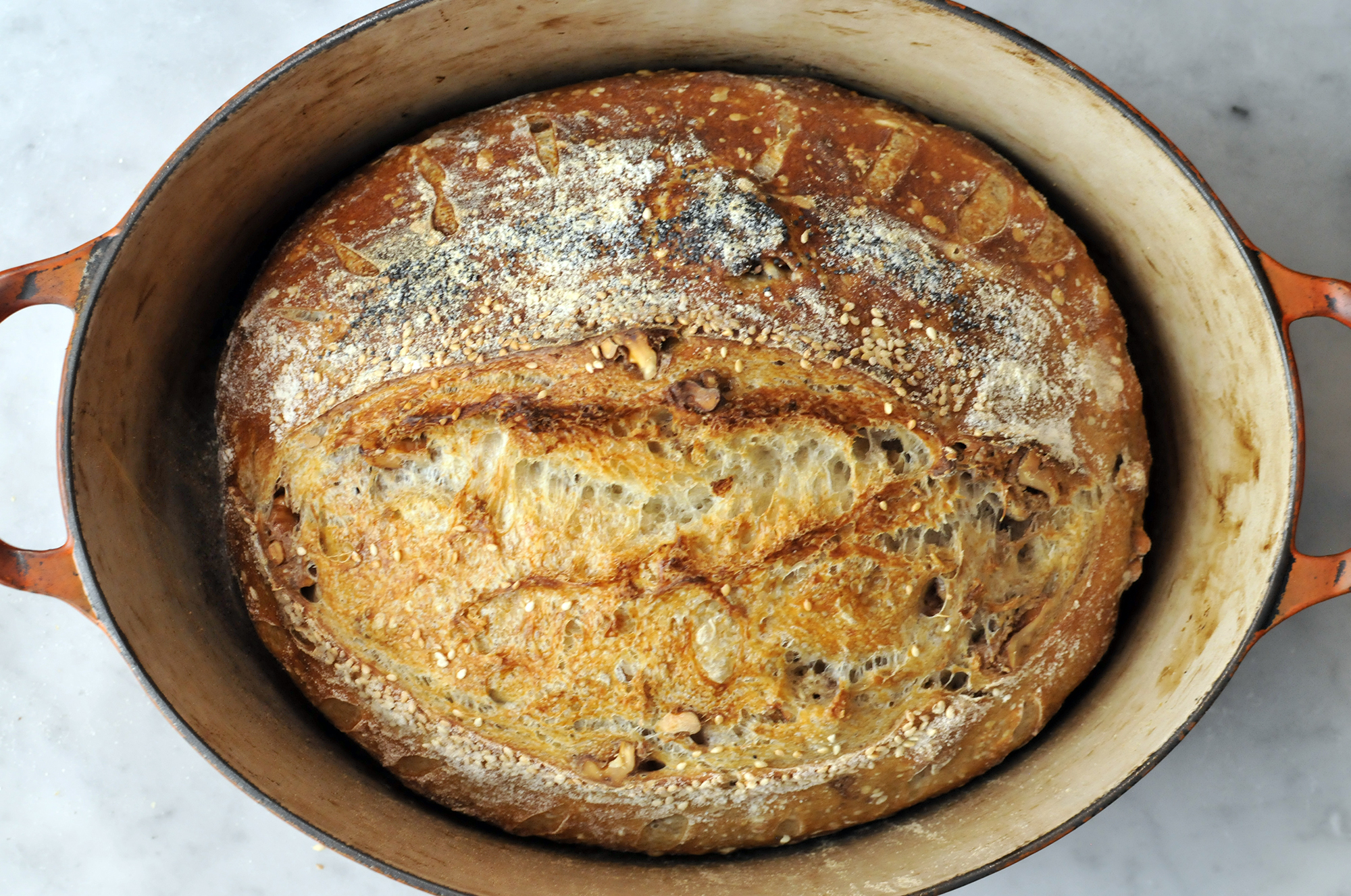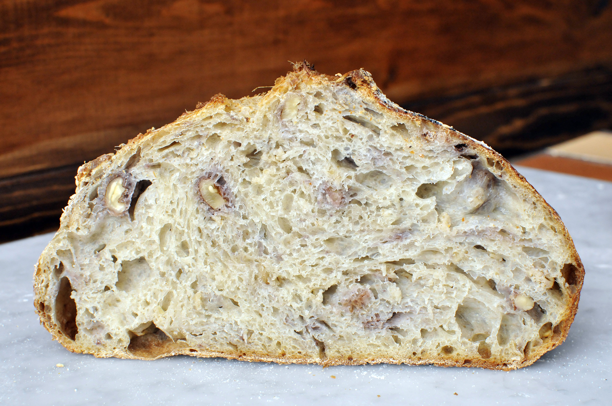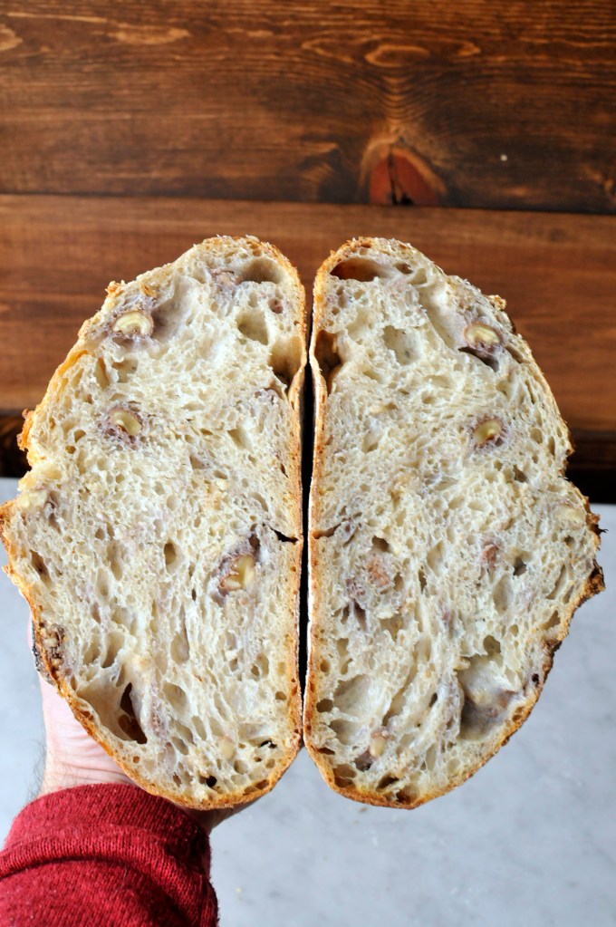 One hour before baking I started preheating the oven, with dutch ovens inside, to 450’F. When it was time to bake, I took the loaves straight from the fridge and placed them in the preheated dutch ovens, gave them a quick score and then put them in the oven. The walnuts might get in the way of the scoring. If that happens, you can gently nudge the walnut out of the way and continue scoring