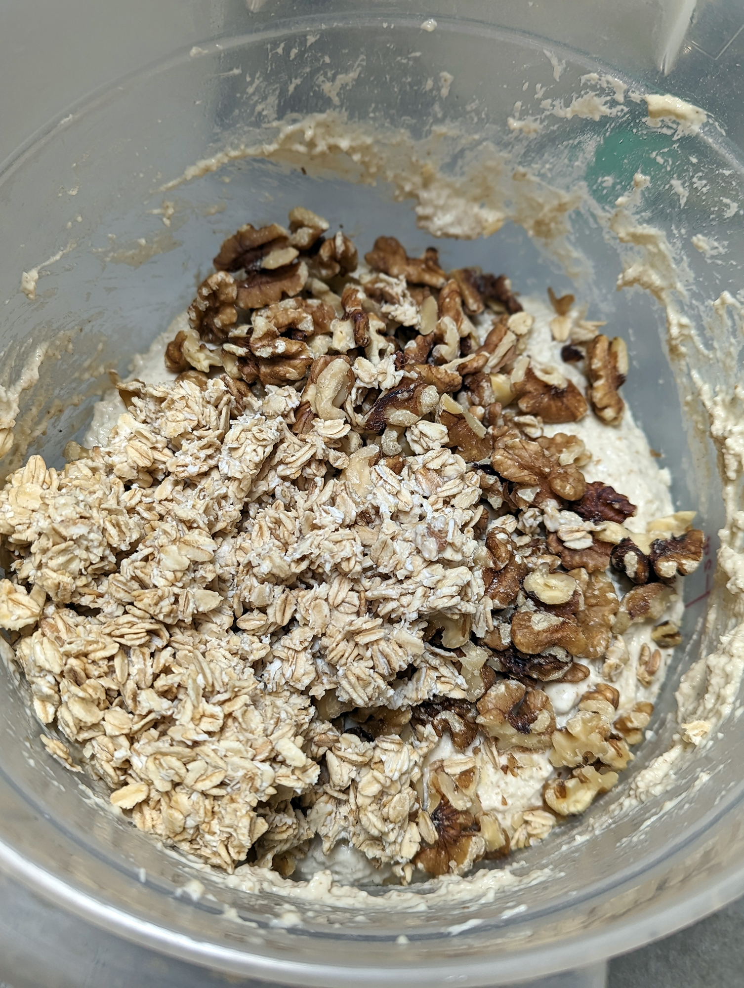 After mixing the flour, starter, water and salt, I performed 4 stretch and folds within the first 2 hours, adding the walnuts and soaked oats at the first fold. It was a little difficult to get the nuts and oats mixed in well, but don’t sweat it. After the subsequent folds it will all come together.