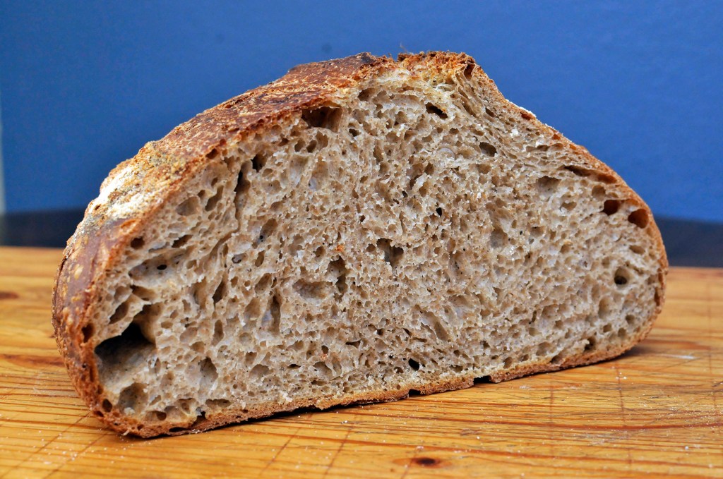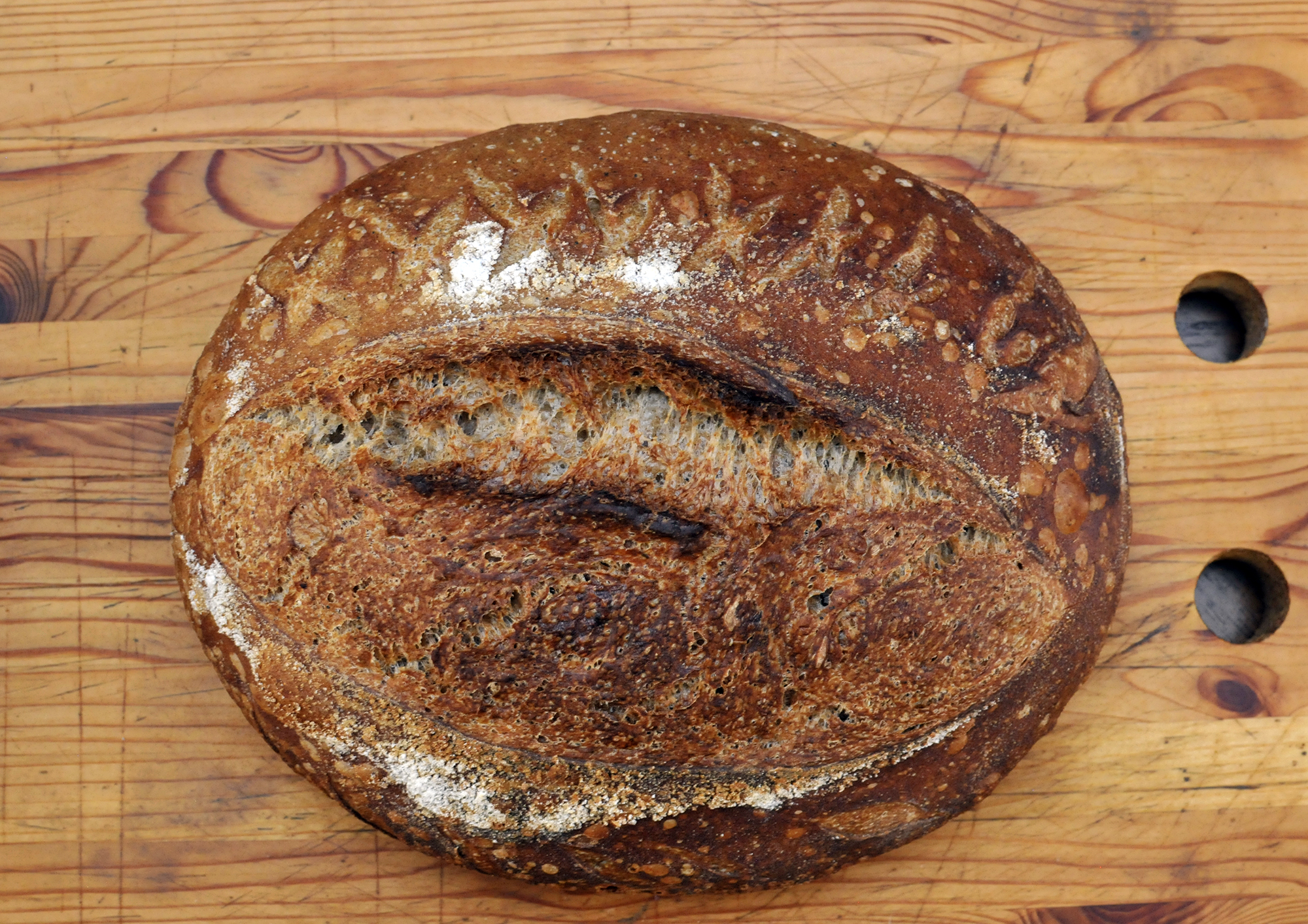 The loaves smell incredibly earthy and full of grains thanks to all of the flours. Thanks to the darker flour, the crumb is dark tan with some black specks throughout. Since most of the additional flours were hindering gluten development, the crumb is a little on the tighter side, but it isn’t overly moist.
