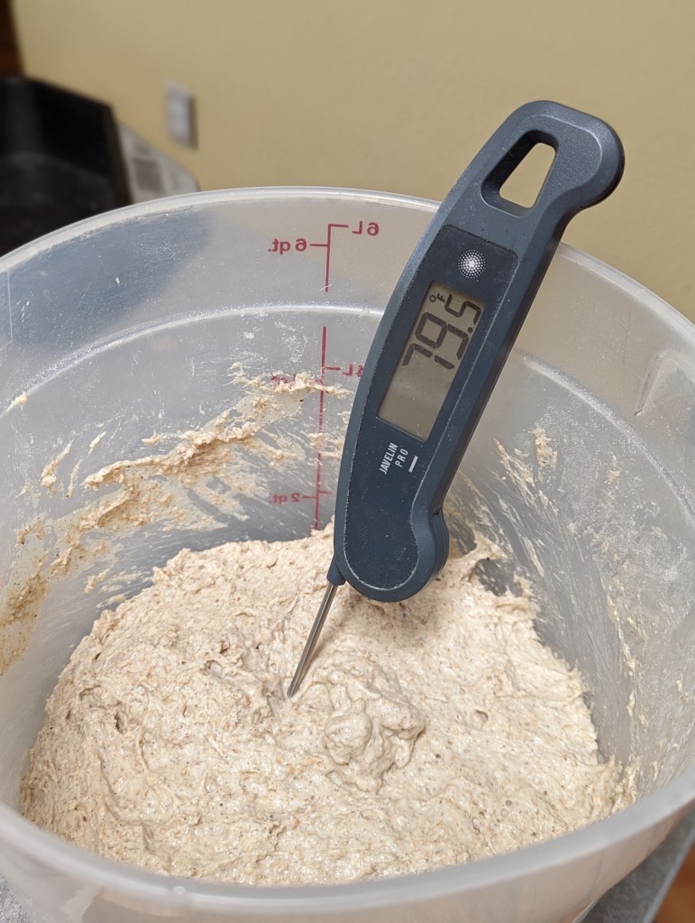 I let the dough bulk ferment at room temperature for about 7 hours and 30 minutes. My dough rose to just under the 4qt line in my Cambro bucket. Bulk fermentation can take anywhere between 7-9 hours depending on the temperature of your kitchen and how active your culture is. My bulk ferments using this method often take a little less than 8 hours.