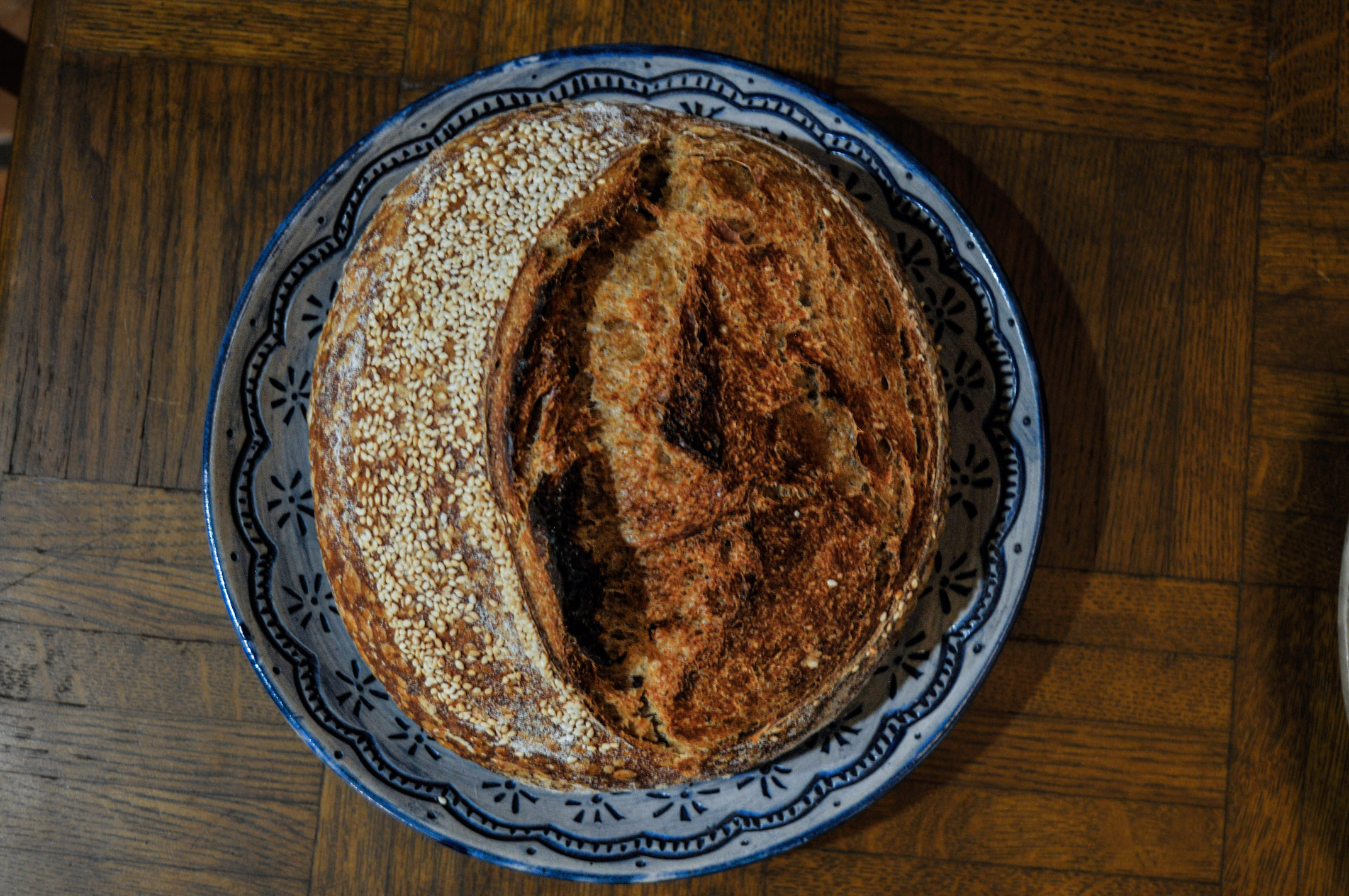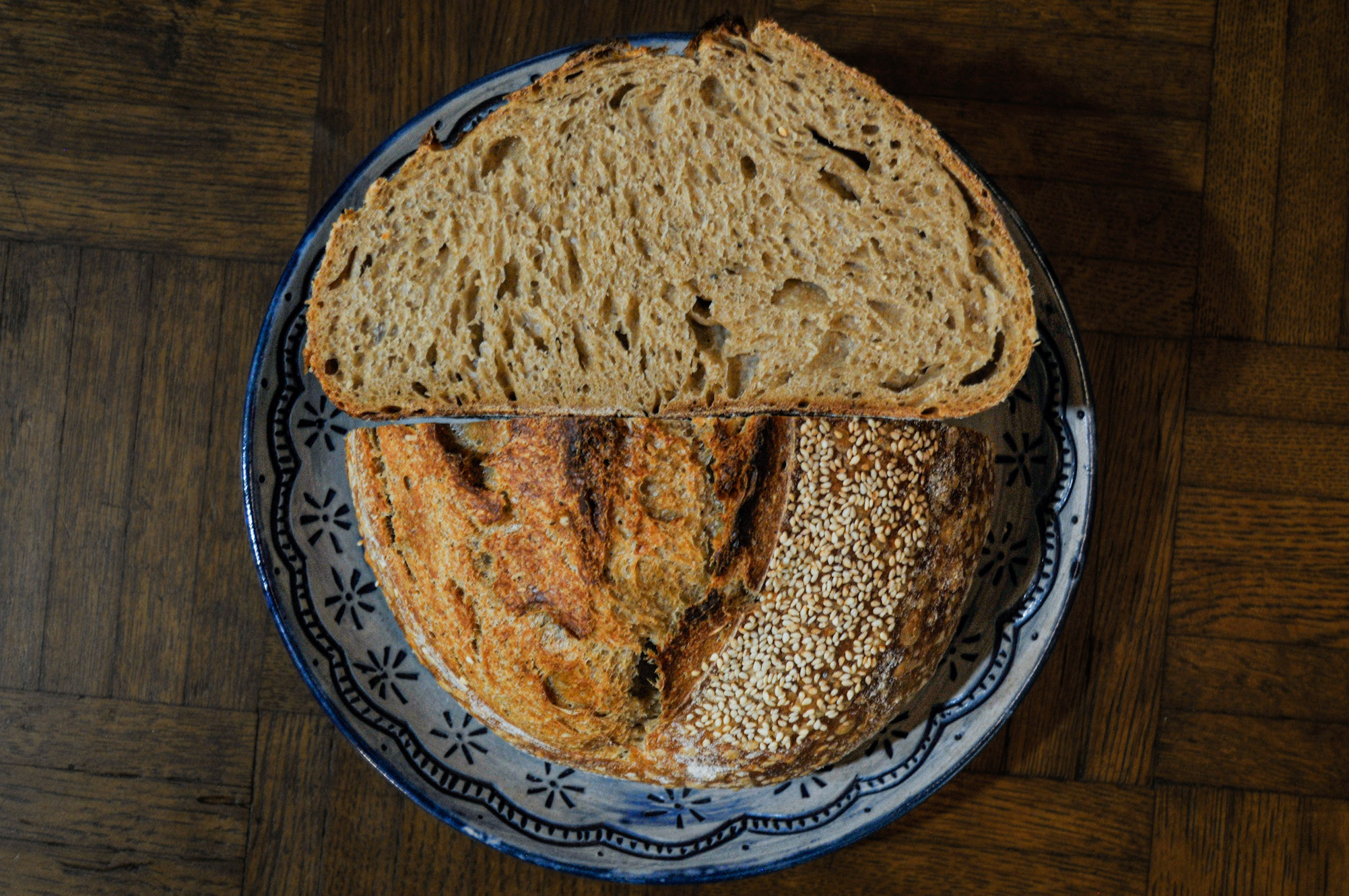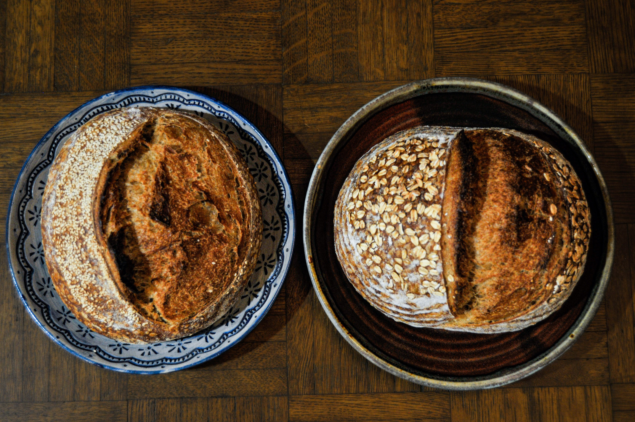 One hour before baking I started preheating the oven, with dutch ovens inside, to 450’F. When it was time to bake, I took the loaves straight from the fridge and placed them in the preheated dutch ovens, gave them a quick score and then put them in the oven.