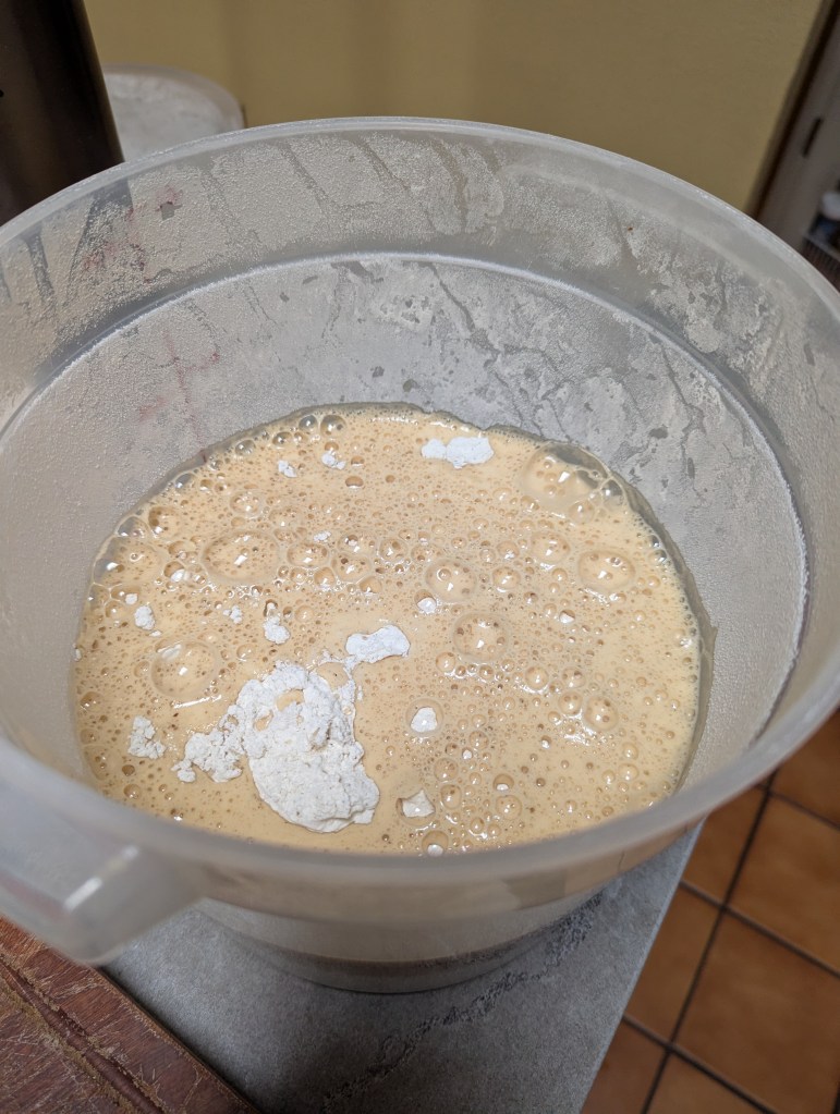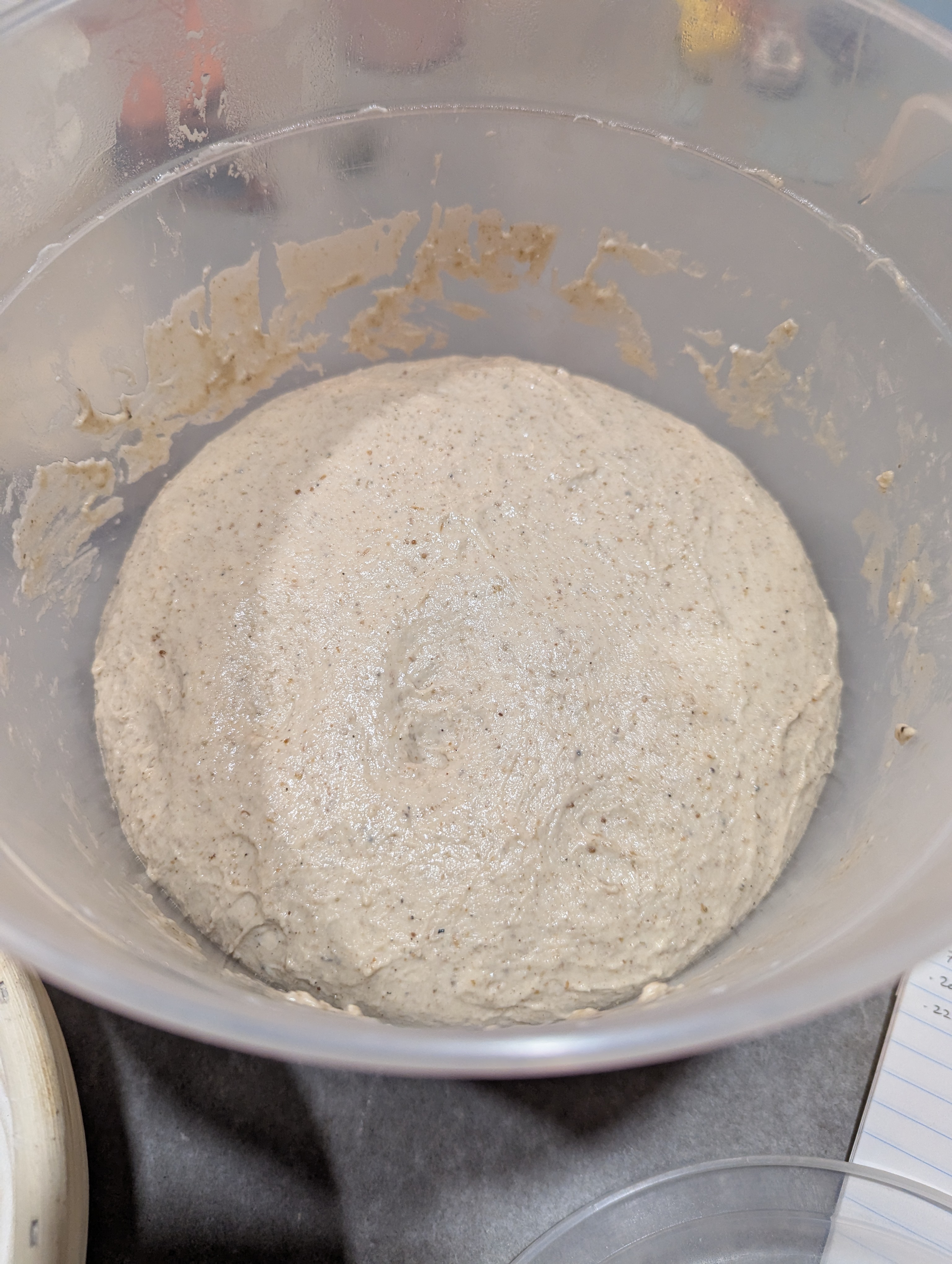 After warming the beer, I weigh out my starter directly into the beer so I can mix it together first which makes it easier to incorporate into the flour. Speaking of flour, if you don’t have spent grain flour laying around, just use more rye, wheat or bread flour instead.