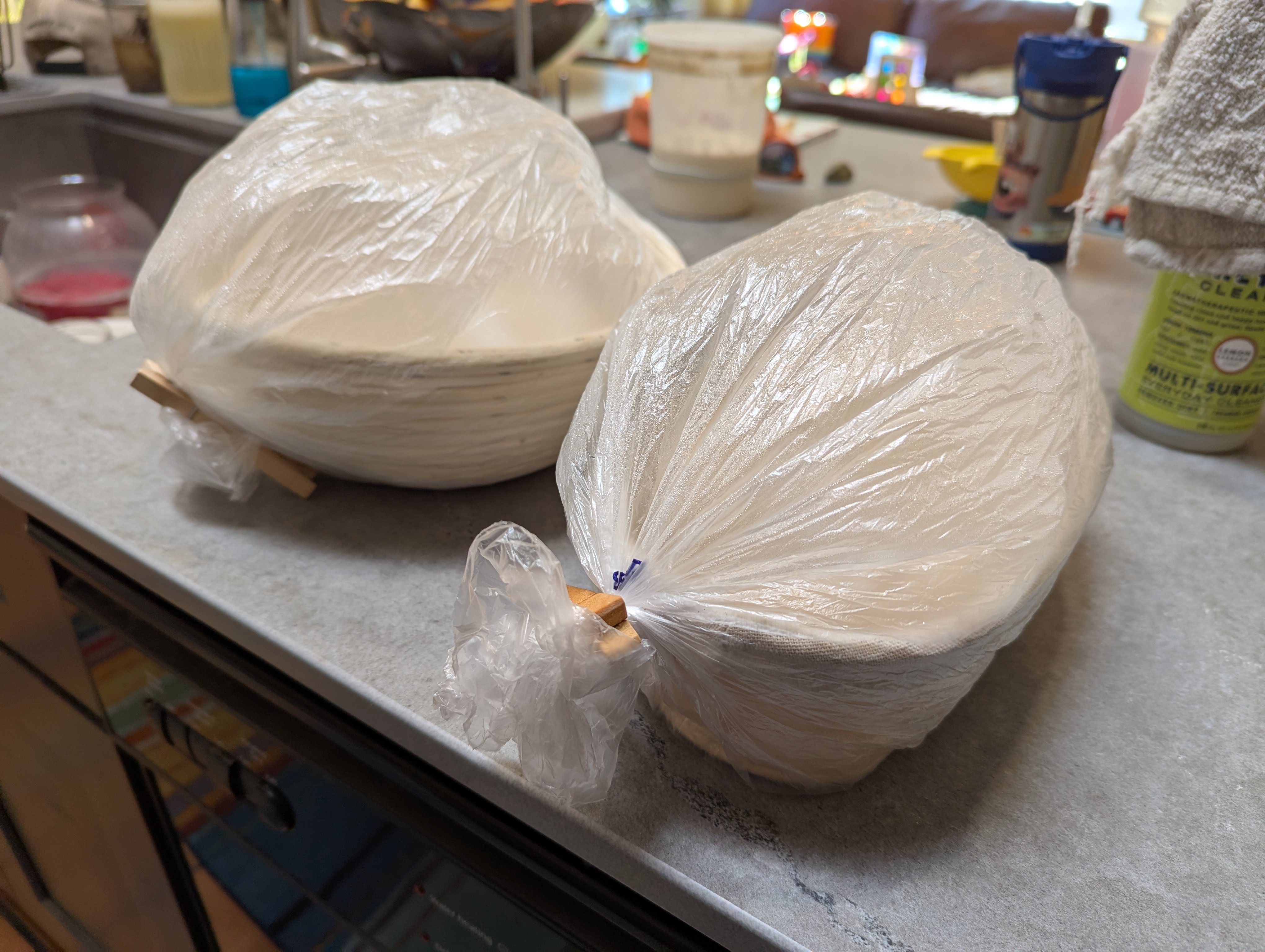 Once the dough had doubled, I divided and shaped the loaves and put them in bannetons that I liberally dusted with rice flour. I put the bannetons in vegetable bags and then placed them in the fridge for a 15 hour cold proof.