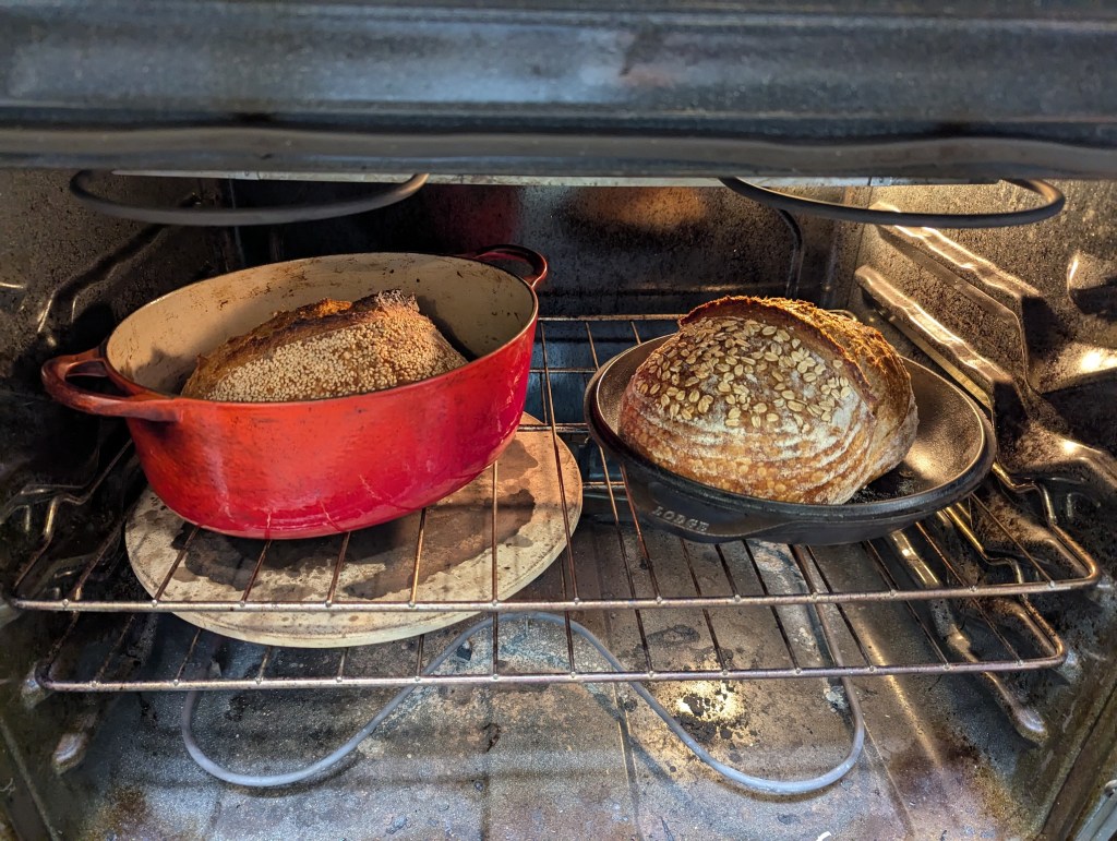 I baked the loaves at 450’F for 20 minutes covered, then removed the lid of the dutch ovens and baked for an additional 30 minutes.